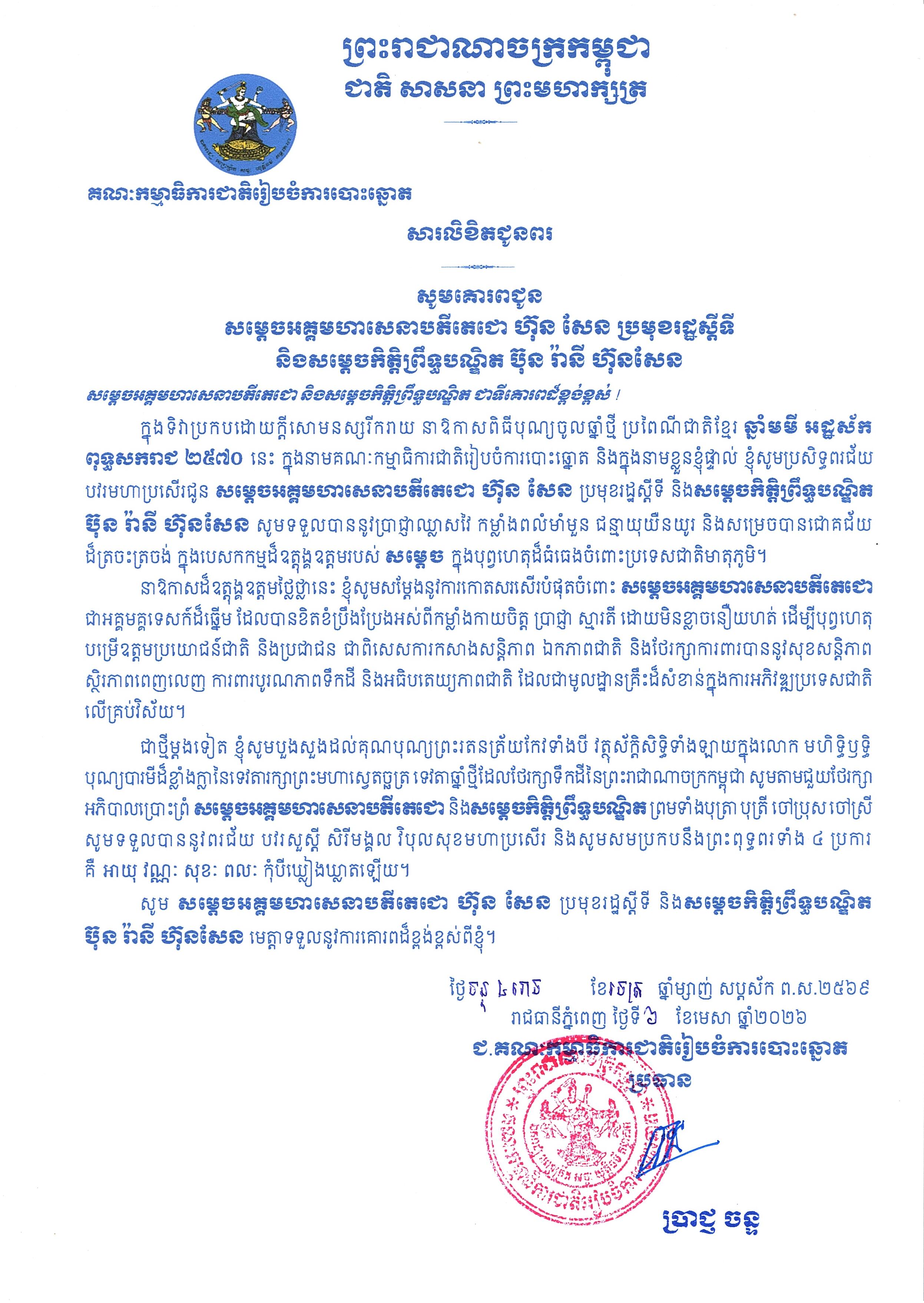 (ភ្នំពេញ)៖ ឯកឧត្តម ប្រាជ្ញ ចន្ទ ប្រធានគណៈកម្មាធិការជាតិរៀបចំការបោះឆ្នោត (គ.ជ.ប) និងមន្ត្រីរាជការក្រោមឱវាទទាំងអស់ សូមផ្ញើសារលិខិតគោរពជូនពរ សម្ដេចអគ្គមហាសេនាបតីតេជោ ហ៊ុន សែន ប្រធានព្រឹទ្ធសភាពនៃកម្ពុជា និងសម្ដេចកិត្តិព្រឹទ្ធបណ្ឌិត ប៊ុន រ៉ានី ហ៊ុនសែន ប្រធានកាកបាទក្រហមកម្ពុជា នៅក្នុងឱកាសពិធីបុណ្យចូលឆ្នាំថ្មី ប្រពៃណីជាតិខ្មែរ ឆ្នាំមមី អដ្ឋស័ក ពុទ្ធសករាជ ២៥៦៩។