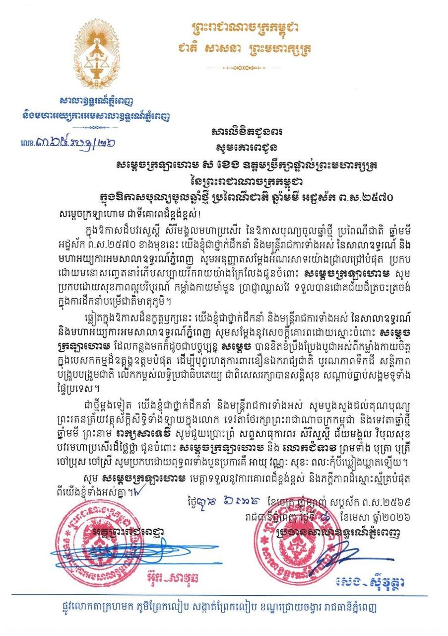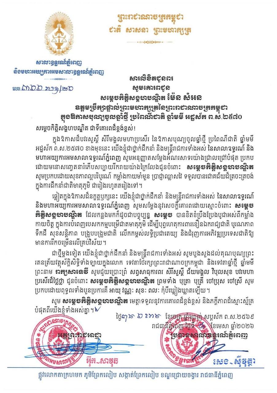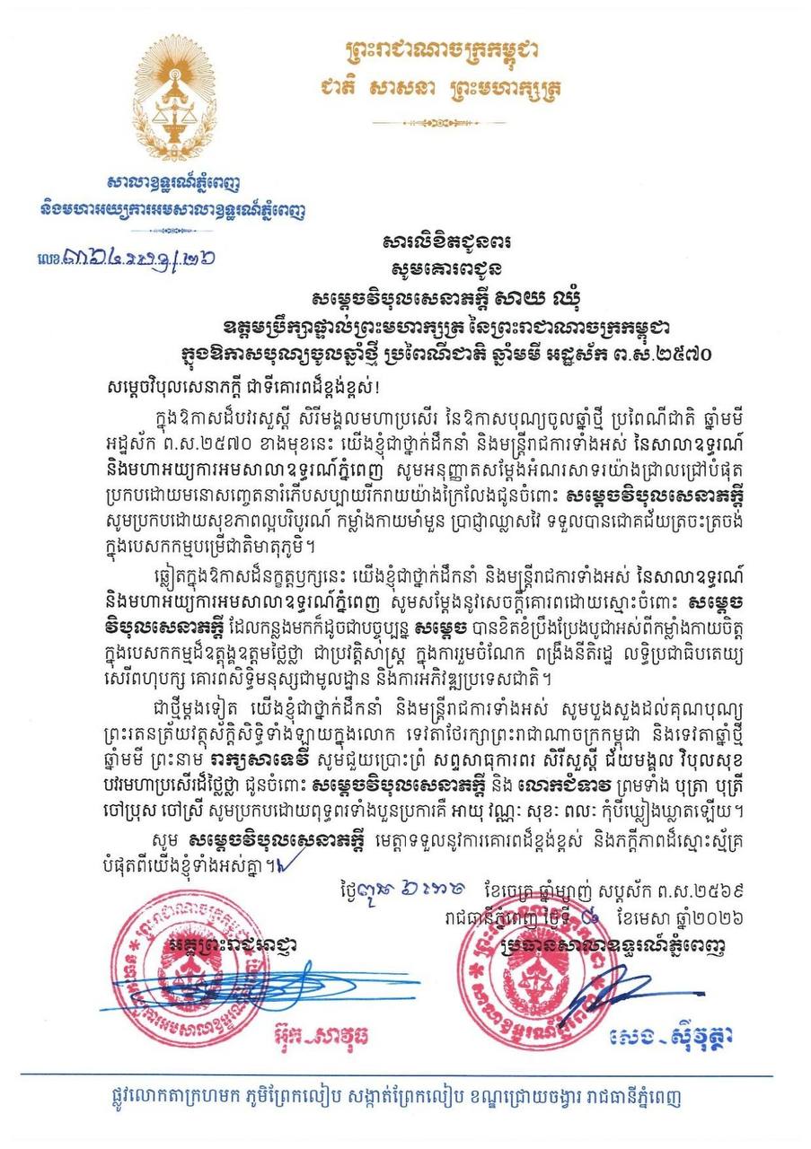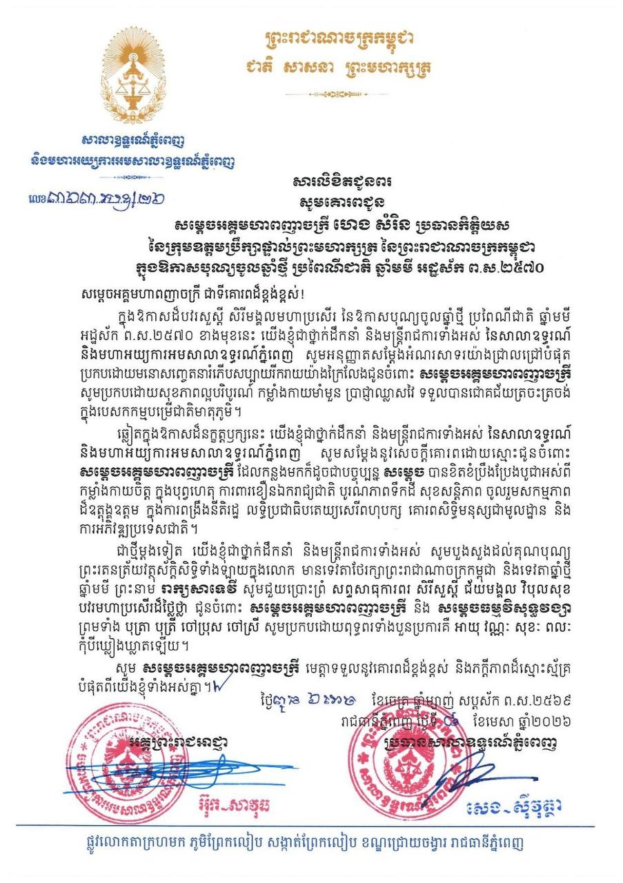 (ភ្នំពេញ)៖ ឯកឧត្តម សេង ស៉ីវុត្ថា ប្រធានសាលាឧទ្ធរណ៍ភ្នំពេញ និង ឯកឧត្តម អ៊ុក សាវុធ អគ្គព្រះរាជអាជ្ញា នៃមហាអយ្យការអមសាលាឧទ្ធរណ៍ភ្នំពេញ ព្រមទាំងថ្នាក់ដឹកនាំ និងមន្ត្រីរាជការ នៃសាលាឧទ្ធរណ៍ភ្នំពេញ និងមហាអយ្យការអមសាលាឧទ្ធរណ៍ បានផ្ញើសារលិខិតគោរពជូនពរ សម្តេចអគ្គមហាពញាចក្រី ហេង សំរិន ប្រធានកិត្តិយសនៃក្រុមឧត្តមប្រឹក្សាផ្ទាល់ព្រះមហាក្សត្រ, សម្តេចក្រឡាហោម ស ខេង ឧត្តមប្រឹក្សាផ្ទាល់ព្រះមហាក្សត, សម្តេចវិបុលសេនាភក្តី សាយ ឈុំ ឧត្តមប្រឹក្សាផ្ទាល់ព្រះមហាក្សត្រ, សម្តេចវិជ័យសេនា ទៀ បាញ់ ឧត្តមប្រឹក្សាផ្ទាល់ព្រះមហាក្សត្រ និងសម្តេចកិត្តិសង្គហបណ្ឌិត ម៉ែន សំអន ឧត្តមប្រឹក្សាផ្ទាល់ព្រះមហាក្សត្រ នៅក្នុងឱកាសពិធីបុណ្យចូលឆ្នាំថ្មី ប្រពៃណីជាតិខ្មែរ ឆ្នាំមមី អដ្ឋស័ក ពុទ្ធសករាជ ២៥៦៩។