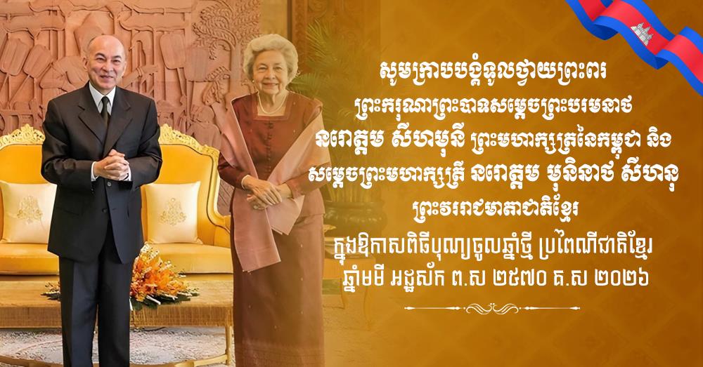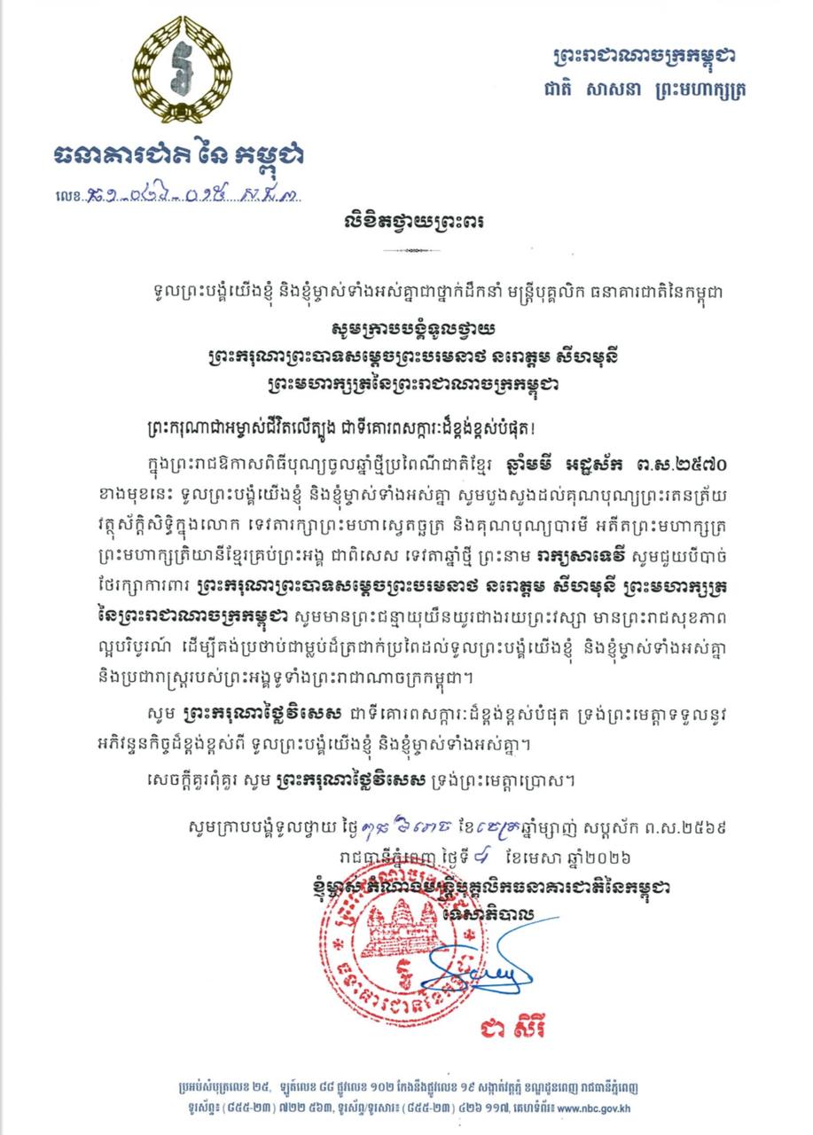 (ភ្នំពេញ)៖ ទូលព្រះបង្គំជាខ្ញុំ ជា សិរី អគ្គទេសាភិបាល ព្រមទាំងថ្នាក់ដឹកនាំ មន្ត្រីបុគ្គលិក ធនាគារជាតិនៃកម្ពុជាទាំងអស់ សូមព្រះបរមរាជានុញ្ញាត ក្រាបបង្គំទូលថ្វាយព្រះពរ ព្រះករុណាព្រះបាទសម្តេចព្រះបរមនាថ នរោត្តម សីហមុនី ព្រះមហាក្សត្រនៃកម្ពុជា និងសម្ដេចព្រះមហាក្សត្រី នរោត្តម មុនិនាថ សីហនុ ព្រះវររាជមាតាជាតិខ្មែរ ជាទីគោរពសក្ការៈដ៏ខ្ពង់ខ្ពស់បំផុត នៅក្នុងឱកាសពិធីបុណ្យចូលឆ្នាំថ្មី ប្រពៃណីជាតិខ្មែរ ឆ្នាំមមី អដ្ឋស័ក ពុទ្ធសករាជ ២៥៦៩ ត្រូវនឹងថ្ងៃទី ១៤-១៥-១៦ ខែមេសា ឆ្នាំ២០២៦ សូមព្រះអង្គទ្រង់ប្រកបដោយព្រះកាយពលរឹងមាំខ្លាំងក្លា ព្រះបញ្ញាញាណភ្លឺថ្លាត្រចះត្រចង់ ព្រះរាជសុខភាពល្អបរិបូរណ៍ ព្រះជន្មាយុយឺនយូរជាងរយព្រះវស្សា ចាកផុតពីព្រះរោគាព្យាធិ ដើម្បីព្រះអង្គទ្រង់គង់ប្រថាប់នៅក្នុងព្រះបរមសិរីរាជសម្បត្តិ ជាព្រះម្លប់ដ៏ត្រជាក់ត្រជុំ សម្បូរសប្បាយ ចម្រុងចម្រើន ថ្កុំថ្កើងរុងរឿងរបស់មាតុភូមិកម្ពុជាជាទីស្នេហា និងប្រជានុរាស្ត្រ ដើម្បីបន្តព្រះរាជបេសកកម្មដ៏ឧត្តុង្គឧត្តម។
