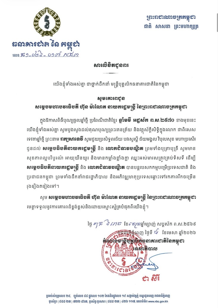 (ភ្នំពេញ)៖ លោកជំទាវបណ្ឌិត ជា សិរី អគ្គទេសាភិបាល ព្រមទាំងថ្នាក់ដឹកនាំ មន្ត្រីបុគ្គលិក ធនាគារជាតិនៃកម្ពុជាទាំងអស់ បានផ្ញើសារលិខិតគោរពជូនពរ សម្ដេចមហាបវរធិបតី ហ៊ុន ម៉ាណែត នាយករដ្ឋមន្ត្រីនៃកម្ពុជា និងលោកជំទាវបណ្ឌិត ពេជ ចន្ទមុន្នី ហ៊ុនម៉ាណែត នៅក្នុងឱកាសពិធីបុណ្យចូលឆ្នាំថ្មី ប្រពៃណីជាតិខ្មែរ ឆ្នាំមមី។