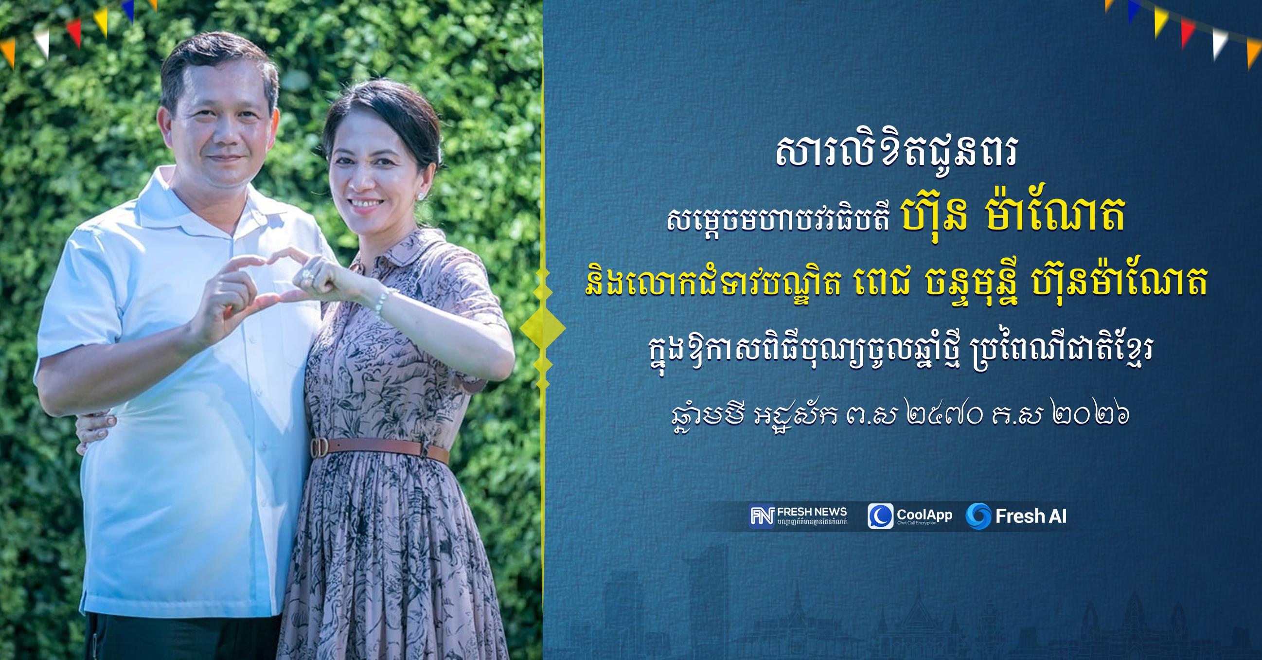 ជាថ្មីម្តងទៀត យើងខ្ញុំសូមលើកហត្ថបួងសួងដល់គុណបុណ្យព្រះរតនត្រ័យ គុណកែវទាំងបី វត្ថុស័ក្តិសិទ្ធិទាំងឡាយក្នុងលោក ជាពិសេសទេវតាថែរក្សាឆ្នាំថ្មី ព្រះនាម រាក្យសាទេវី សូមតាមជួយថែរក្សា ការពារ អភិបាល ប្រោះព្រំនូវសព្ទសាធុការពរជ័យគ្រប់ប្រការ ជូនចំពោះសម្ដេចបវរធិបតី និងលោកជំទាវបណ្ឌិត ព្រមទាំងបុត្រាបុត្រី សូមបានសមប្រកបដោយពុទ្ធពរដ៏ប្រសើរថ្លៃថ្លាទាំងបួនប្រការ គឺ អាយុ វណ្ណៈ សុខៈ និងពលៈ ជានិច្ចនិរន្តរ៍កុំបីឃ្លៀងឃ្លាតឡើយ៕