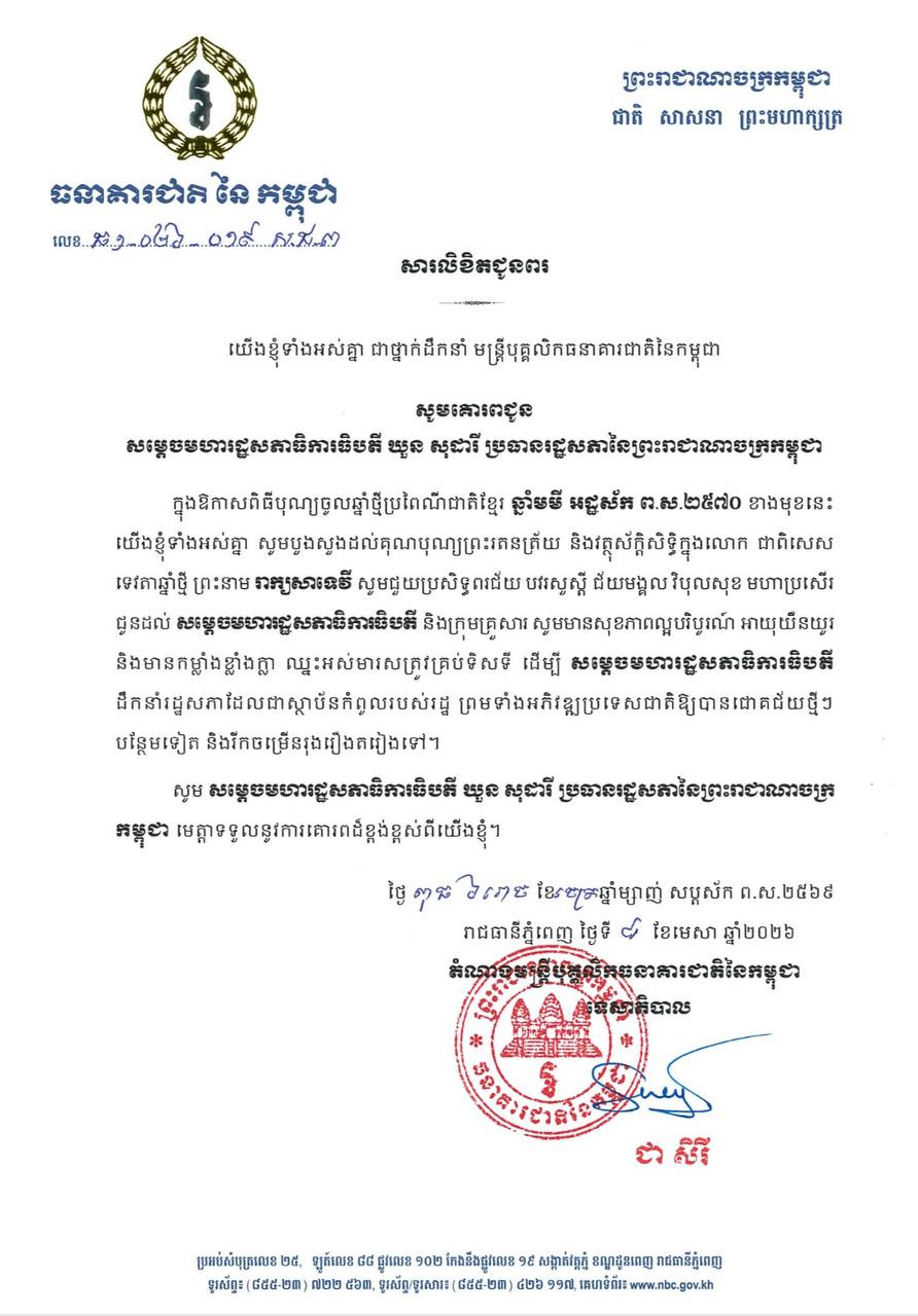 (ភ្នំពេញ)៖ លោកជំទាវបណ្ឌិត ជា សិរី អគ្គទេសាភិបាល ព្រមទាំងថ្នាក់ដឹកនាំ មន្ត្រីបុគ្គលិក ធនាគារជាតិនៃកម្ពុជាទាំងអស់ បានផ្ញើសារលិខិតគោរពជូនពរ សម្តេចមហារដ្ឋសភាធិការធិបតី ឃួន សុដារី ប្រធានរដ្ឋសភា នៃព្រះរាជាណាចក្រកម្ពុជា នៅក្នុងឱកាសពិធីបុណ្យចូលឆ្នាំថ្មី ប្រពៃណីជាតិខ្មែរ ឆ្នាំមមី អដ្ឋស័ក ពុទ្ធសករាជ ២៥៦៩។