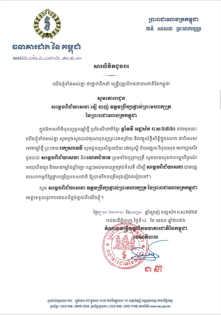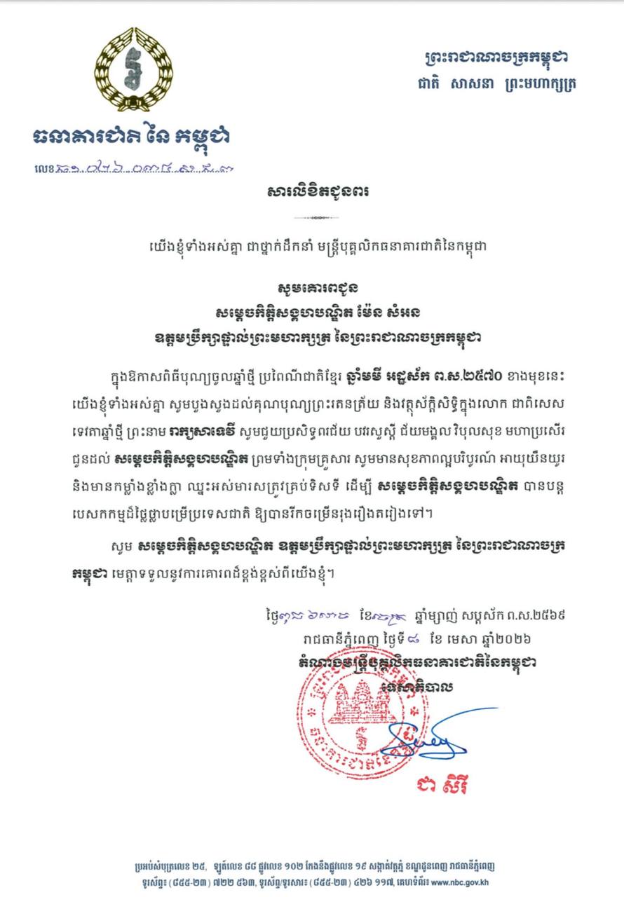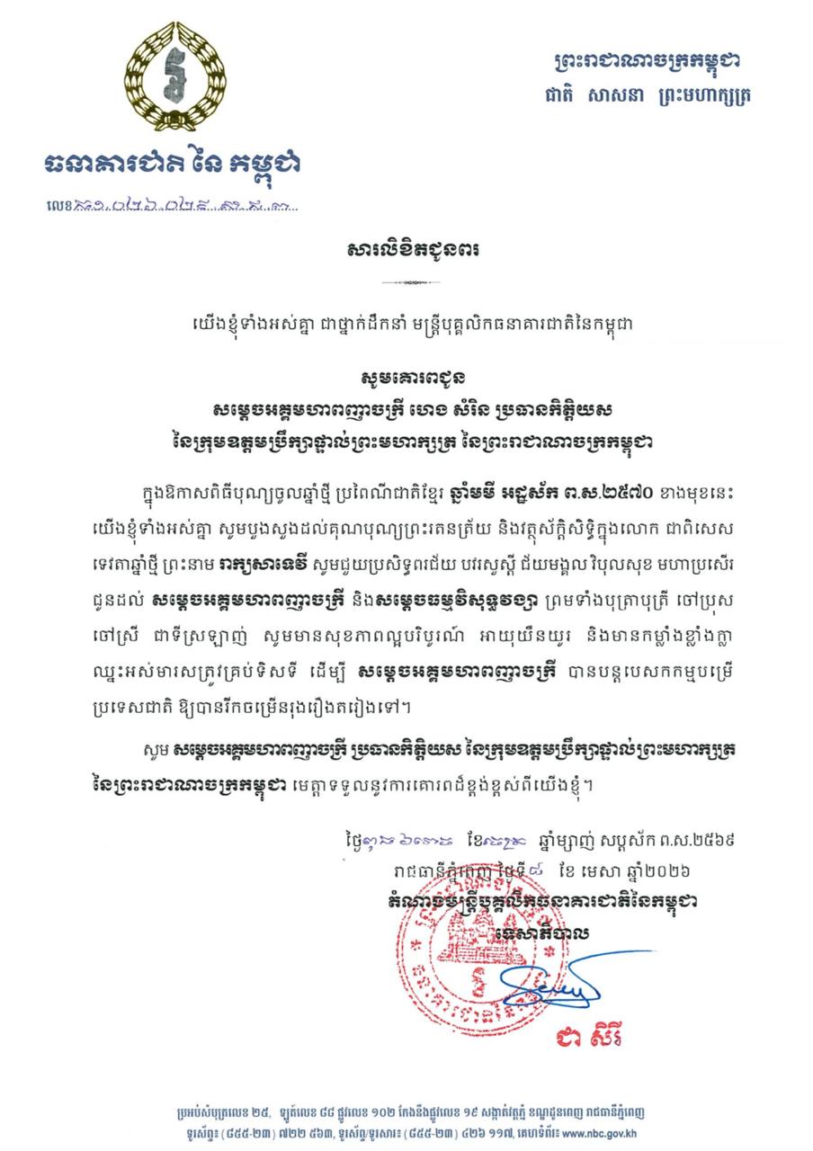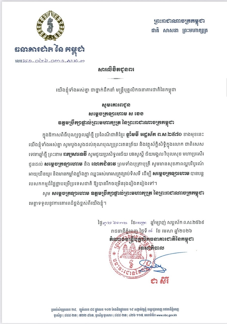 (ភ្នំពេញ)៖ លោកជំទាវបណ្ឌិត ជា សិរី អគ្គទេសាភិបាល ព្រមទាំងថ្នាក់ដឹកនាំ មន្ត្រីបុគ្គលិក ធនាគារជាតិនៃកម្ពុជាទាំងអស់ សូមផ្ញើសារលិខិតគោរពជូនពរ សម្តេចអគ្គមហាពញាចក្រី ហេង សំរិន, សម្តេចវិបុលសេនាភក្តី សាយ ឈុំ, សម្តេចក្រឡាហោម ស ខេង, សម្តេចពិជ័យសេនា ទៀ បាញ់ និងសម្ដេចកិត្តិសង្គហបណ្ឌិត ម៉ែន សំអន ដែលជាឧត្តមប្រឹក្សាផ្ទាល់ព្រះមហាក្សត្រ នៅក្នុងឱកាសពិធីបុណ្យចូលឆ្នាំថ្មី ប្រពៃណីជាតិខ្មែរ ឆ្នាំមមី អដ្ឋស័ក ពុទ្ធសករាជ ២៥៦៩។