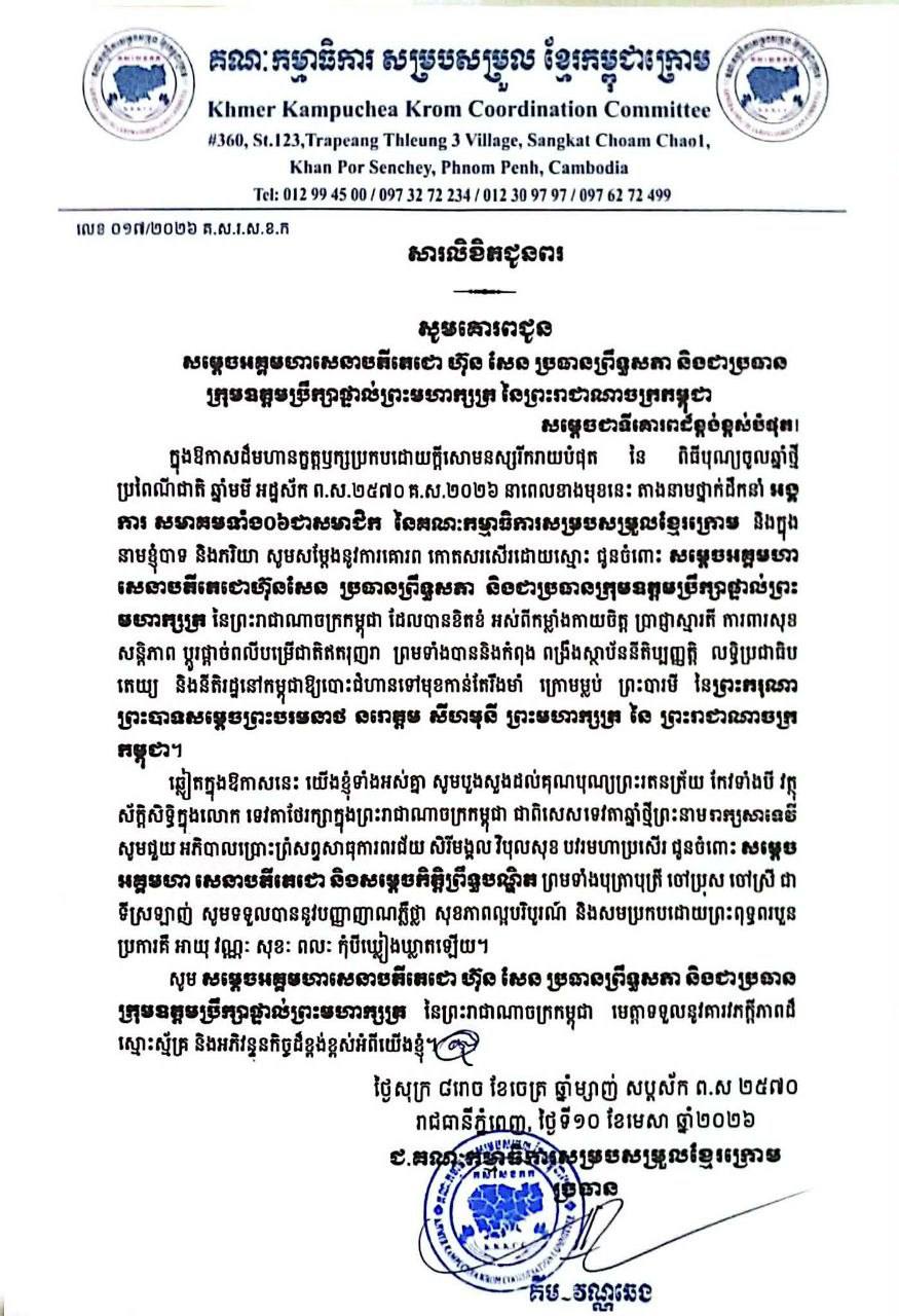 (ភ្នំពេញ)៖ លោក គឹម វណ្ណឆេង គណៈកម្មាធិការសម្របសម្រួលខ្មែរក្រោម ប្រធាន សូមផ្ញើសារលិខិតគោរពជូនពរ សម្ដេចអគ្គមហាសេនាបតីតេជោ ហ៊ុន សែន ប្រធានព្រឹទ្ធសភាពនៃកម្ពុជា និងសម្ដេចកិត្តិព្រឹទ្ធបណ្ឌិត ប៊ុន រ៉ានី ហ៊ុនសែន ប្រធានកាកបាទក្រហមកម្ពុជា នៅក្នុងឱកាសពិធីបុណ្យចូលឆ្នាំថ្មី ប្រពៃណីជាតិខ្មែរ ឆ្នាំមមី អដ្ឋស័ក ពុទ្ធសករាជ ២៥៦៩។