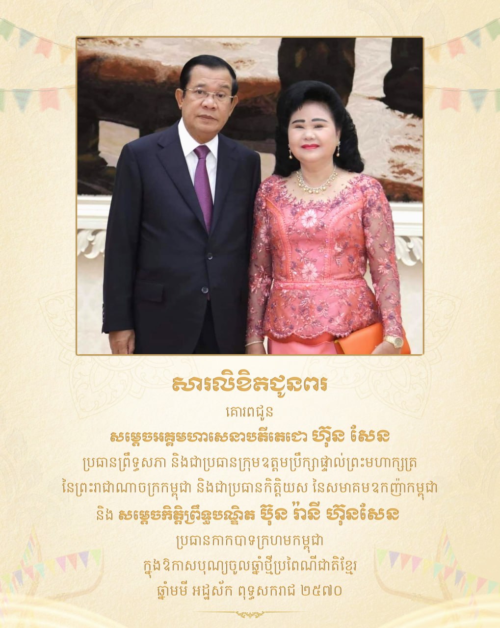 ក្នុងឱកាសដ៏មហានក្ខត្តឫក្សនេះ យើងខ្ញុំលំឱនកាយវាចាចិត្តបួងសួង ដល់គុណបុណ្យព្រះរតនត្រ័យ វត្ថុស័ក្ដិសិទ្ធិក្នុងលោក ជាពិសេស ទេវតាឆ្នាំថ្មី សូមប្រទាននូវពរជ័យបវរមហាប្រសើរជូន សម្ដេចតេជោ និងសម្ដេចកិត្តិព្រឹទ្ធបណ្ឌិត សូមប្រកបដោយ បញ្ញាញាណភ្លឺថ្លា កាយពលមាំមួន សុខភាពល្អបរិបូរណ៍ ជន្មាយុយឺនយូរ ដើម្បីជាគ្រឹះក្នុងការដឹកនាំព្រឹទ្ធសភា ដែលជាស្ថាប័ននីតិប្បញ្ញត្តិកំពូលនៃព្រះរាជាណាចក្រ កម្ពុជា ឱ្យសម្រេចបាននូវស្នាដៃថ្មីៗធំធេងបន្ថែមទៀត ក្នុងការចូលរួមពង្រីកនីតិរដ្ឋ លទ្ធិប្រជាធិបតេយ្យសេរី ពហុបក្ស ការគោរព សិទិ្ធមនុស្ស ការពង្រឹងសមត្ថភាពស្ថាប័ន និង ការកសាងសមិទ្ធផលជាច្រើន ដើម្បីវឌ្ឍនភាពសង្គមកាន់តែ រីកចម្រើនរុងរឿងខ្លាំងក្លា សំដៅលើកកម្ពស់កិត្យានុភាពជាតិ សុខុមាលភាព និងជីវភាពប្រជាពលរដ្ឋឱ្យ កាន់តែល្អប្រសើរថែមទៀត។