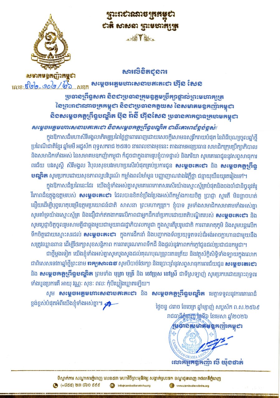 (ភ្នំពេញ)៖ លោកអ្នកឧកញ៉ា លី យ៉ុងផាត់ ប្រធានសមាគមឧកញ៉ាកម្ពុជា និងលោកជំទាវ ព្រមទាំងសមាជិកទាំងអស់ នៃសមាគមឧកញ៉ាកម្ពុជា សូមផ្ញើសារ លិខិតគោរពជូនពរ សម្ដេចអគ្គមហាសេនាបតីតេជោ ហ៊ុន សែន ប្រធានព្រឹទ្ធសភាពនៃកម្ពុជា និងសម្ដេចកិត្តិព្រឹទ្ធបណ្ឌិត ប៊ុន រ៉ានី ហ៊ុនសែន ប្រធានកាកបាទក្រហមកម្ពុជា នៅក្នុងឱកាសពិធីបុណ្យចូលឆ្នាំថ្មី ប្រពៃណីជាតិខ្មែរ ឆ្នាំមមី អដ្ឋស័ក ពុទ្ធសករាជ ២៥៧០។