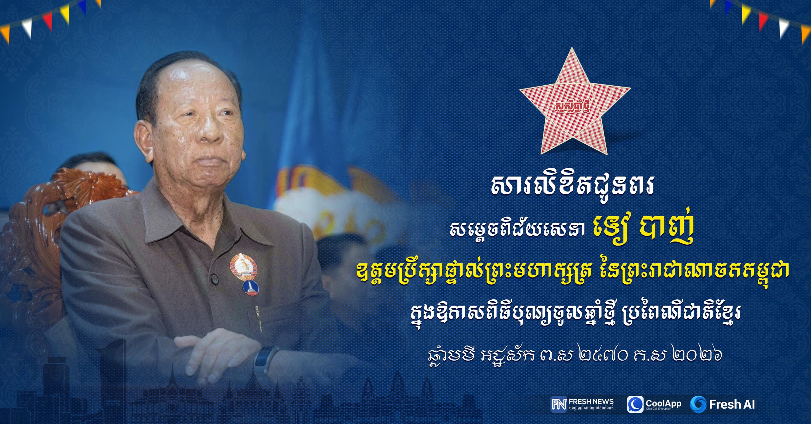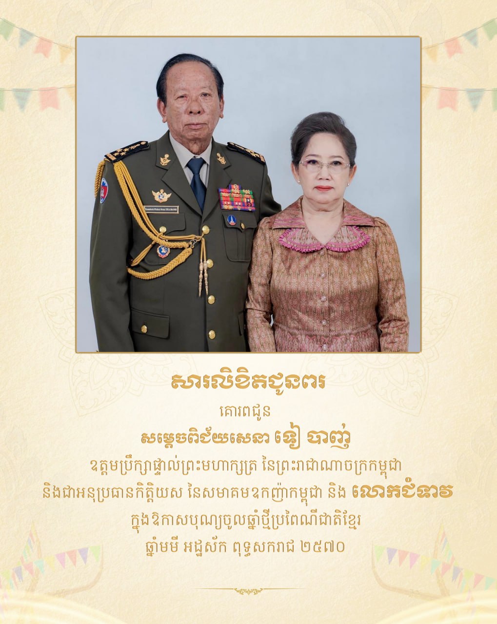 ជាថ្មីម្តងទៀត យើងខ្ញុំសូមលើកហត្ថបួងសួងដល់គុណបុណ្យព្រះរតនត្រ័យ គុណកែវទាំងបី វត្ថុស័ក្តិសិទ្ធិទាំងឡាយក្នុងលោក ជាពិសេសទេវតាថែរក្សាឆ្នាំថ្មី ព្រះនាម រាក្យសាទេវី សូមតាមជួយថែរក្សា ការពារ អភិបាល ប្រោះព្រំនូវសព្ទសាធុការពរជ័យគ្រប់ប្រការ ជូនចំពោះសម្ដេចបវរធិបតី និងលោកជំទាវបណ្ឌិត ព្រមទាំងបុត្រាបុត្រី សូមបានសមប្រកបដោយពុទ្ធពរដ៏ប្រសើរថ្លៃថ្លាទាំងបួនប្រការ គឺ អាយុ វណ្ណៈ សុខៈ និងពលៈ ជានិច្ចនិរន្តរ៍កុំបីឃ្លៀងឃ្លាតឡើយ៕