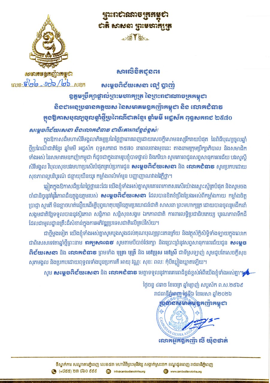 លោកអ្នកឧកញ៉ា លី យ៉ុងផាត់ ផ្ញើសារលិខិតគោរពជូនពរ សម្តេចពិជ័យសេនា ទៀ បាញ់ និងលោកជំទាវ ក្នុងឱកាសពិធីបុណ្យចូលឆ្នាំថ្មី ប្រពៃណីជាតិខ្មែរ ឆ្នាំមមី