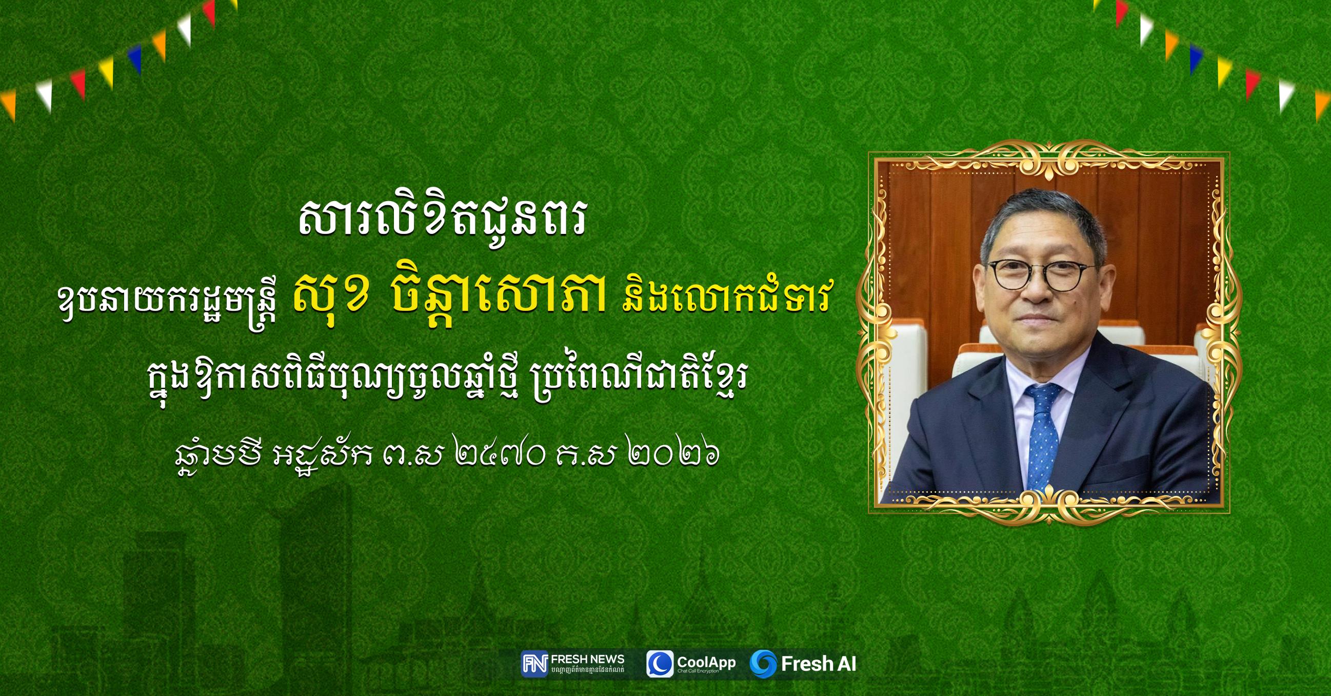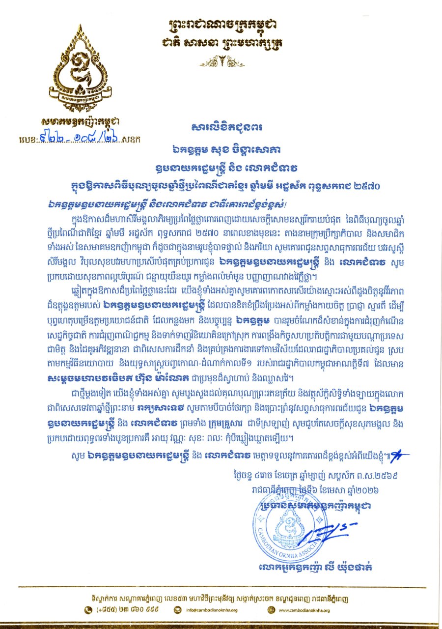 ជាថ្មីម្តងទៀត យើងខ្ញុំសូមលើកហត្ថបួងសួងដល់គុណបុណ្យព្រះរតនត្រ័យ គុណកែវទាំងបី វត្ថុស័ក្តិសិទ្ធិទាំងឡាយក្នុងលោក ជាពិសេសទេវតាថែរក្សាឆ្នាំថ្មី ព្រះនាម រាក្យសាទេវី សូមតាមជួយថែរក្សា ការពារ អភិបាល ប្រោះព្រំនូវសព្ទសាធុការពរជ័យគ្រប់ប្រការ ជូនចំពោះសម្ដេចបវរធិបតី និងលោកជំទាវបណ្ឌិត ព្រមទាំងបុត្រាបុត្រី សូមបានសមប្រកបដោយពុទ្ធពរដ៏ប្រសើរថ្លៃថ្លាទាំងបួនប្រការ គឺ អាយុ វណ្ណៈ សុខៈ និងពលៈ ជានិច្ចនិរន្តរ៍កុំបីឃ្លៀងឃ្លាតឡើយ៕