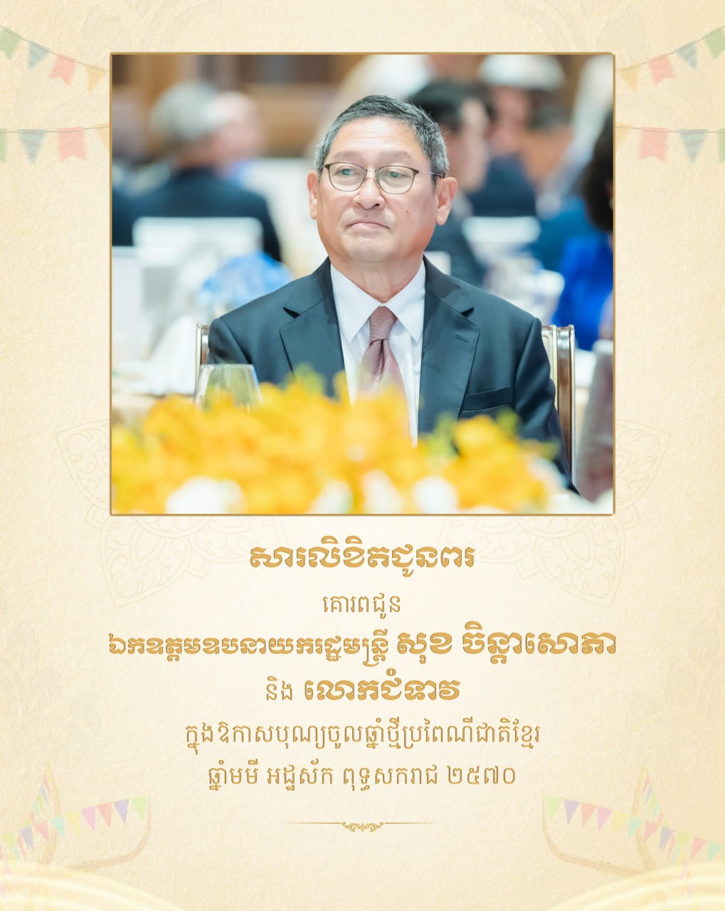 លោកអ្នកឧកញ៉ា លី យ៉ុងផាត់ ផ្ញើសារលិខិតគោរពជូនពរ ឯកឧត្តមឧបនាយករដ្ឋមន្ត្រី សុខ ចិន្តាសោភា និងលោកជំទាវ ក្នុងឱកាសពិធីបុណ្យចូលឆ្នាំថ្មី ប្រពៃណីជាតិខ្មែរ ឆ្នាំមមី