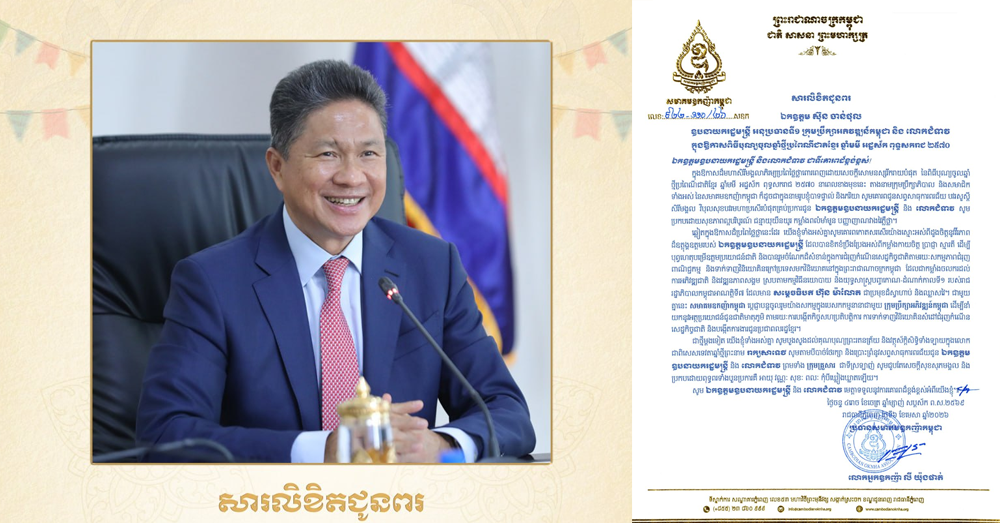ជាថ្មីម្តងទៀត យើងខ្ញុំសូមលើកហត្ថបួងសួងដល់គុណបុណ្យព្រះរតនត្រ័យ គុណកែវទាំងបី វត្ថុស័ក្តិសិទ្ធិទាំងឡាយក្នុងលោក ជាពិសេសទេវតាថែរក្សាឆ្នាំថ្មី ព្រះនាម រាក្យសាទេវី សូមតាមជួយថែរក្សា ការពារ អភិបាល ប្រោះព្រំនូវសព្ទសាធុការពរជ័យគ្រប់ប្រការ ជូនចំពោះសម្ដេចបវរធិបតី និងលោកជំទាវបណ្ឌិត ព្រមទាំងបុត្រាបុត្រី សូមបានសមប្រកបដោយពុទ្ធពរដ៏ប្រសើរថ្លៃថ្លាទាំងបួនប្រការ គឺ អាយុ វណ្ណៈ សុខៈ និងពលៈ ជានិច្ចនិរន្តរ៍កុំបីឃ្លៀងឃ្លាតឡើយ៕