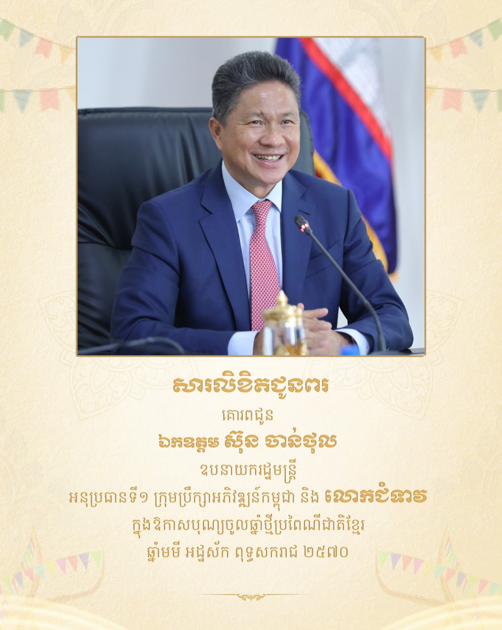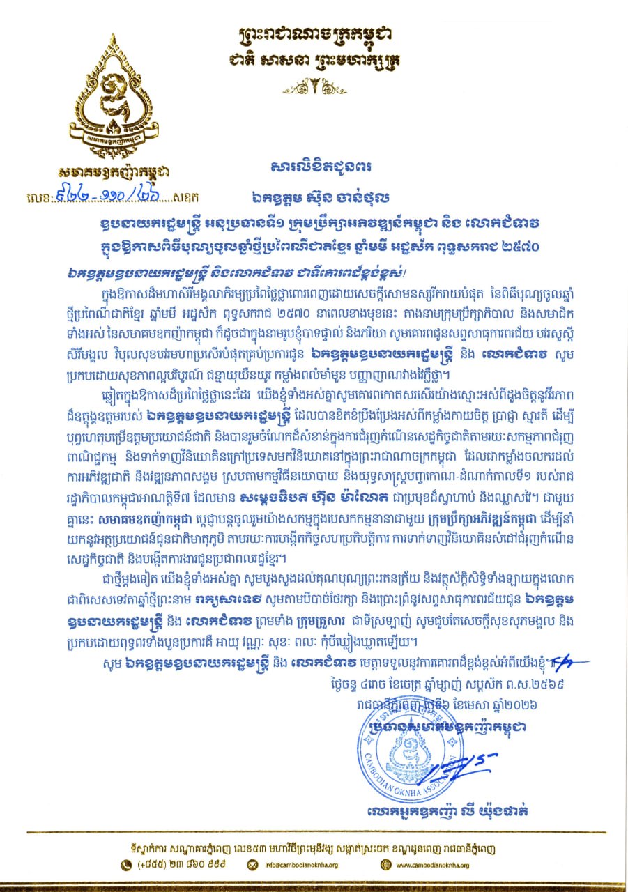 (ភ្នំពេញ)៖ លោកអ្នកឧកញ៉ា លី យ៉ុងផាត់ ប្រធានសមាគមឧកញ៉ាកម្ពុជា និងលោកជំទាវ ព្រមទាំងសមាជិកទាំងអស់ នៃសមាគមឧកញ៉ាកម្ពុជា បានផ្ញើសារលិខិតគោរពជូនពរ គោរពជូន ឯកឧត្តម ស៊ុន ចាន់ថុល ឧបនាយករដ្ឋមន្ត្រី អនុប្រធានទី១ ក្រុមប្រឹក្សាអភិវឌ្ឍន៍កម្ពុជា និងលោកជំទាវ នៅក្នុងឱកាសពិធីបុណ្យចូលឆ្នាំថ្មី ប្រពៃណីជាតិខ្មែរ ឆ្នាំមមី អដ្ឋស័ក ពុទ្ធសករាជ ២៥៧០។