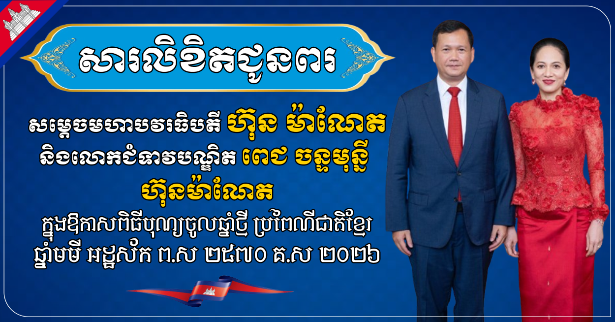 ជាថ្មីម្តងទៀត យើងខ្ញុំសូមលើកហត្ថបួងសួងដល់គុណបុណ្យព្រះរតនត្រ័យ គុណកែវទាំងបី វត្ថុស័ក្តិសិទ្ធិទាំងឡាយក្នុងលោក ជាពិសេសទេវតាថែរក្សាឆ្នាំថ្មី ព្រះនាម រាក្យសាទេវី សូមតាមជួយថែរក្សា ការពារ អភិបាល ប្រោះព្រំនូវសព្ទសាធុការពរជ័យគ្រប់ប្រការ ជូនចំពោះសម្ដេចបវរធិបតី និងលោកជំទាវបណ្ឌិត ព្រមទាំងបុត្រាបុត្រី សូមបានសមប្រកបដោយពុទ្ធពរដ៏ប្រសើរថ្លៃថ្លាទាំងបួនប្រការ គឺ អាយុ វណ្ណៈ សុខៈ និងពលៈ ជានិច្ចនិរន្តរ៍កុំបីឃ្លៀងឃ្លាតឡើយ៕