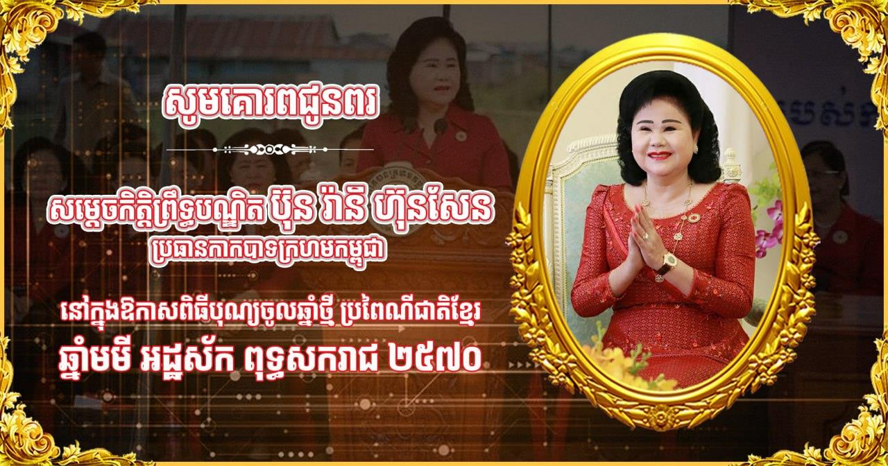 ក្នុងឱកាសដ៏មហានក្ខត្តឫក្សនេះ យើងខ្ញុំលំឱនកាយវាចាចិត្តបួងសួង ដល់គុណបុណ្យព្រះរតនត្រ័យ វត្ថុស័ក្ដិសិទ្ធិក្នុងលោក ជាពិសេស ទេវតាឆ្នាំថ្មី ព្រះនាម គោរាគទេវី សូមប្រទាននូវពរជ័យបវរមហាប្រសើរជូន សម្ដេចកិត្តិព្រឹទ្ធបណ្ឌិត និងសម្តេចតេជោ សូមប្រកបដោយ បញ្ញាញាណភ្លឺថ្លា កាយពលមាំមួន សុខភាពល្អបរិបូរណ៍ ជន្មាយុយឺនយូរ ដើម្បីជាគ្រឹះក្នុងការដឹកនាំស្ថាប័នកាកបាទក្រហម ដើម្បីវឌ្ឍនភាពសង្គមកាន់តែរីកចម្រើនរុងរឿងខ្លាំង ក្លា សំដៅលើកកម្ពស់កិត្យានុភាពជាតិ សុខុមាលភាព និងជីវភាពប្រជាពលរដ្ឋឱ្យកាន់តែល្អប្រសើរថែមទៀត។