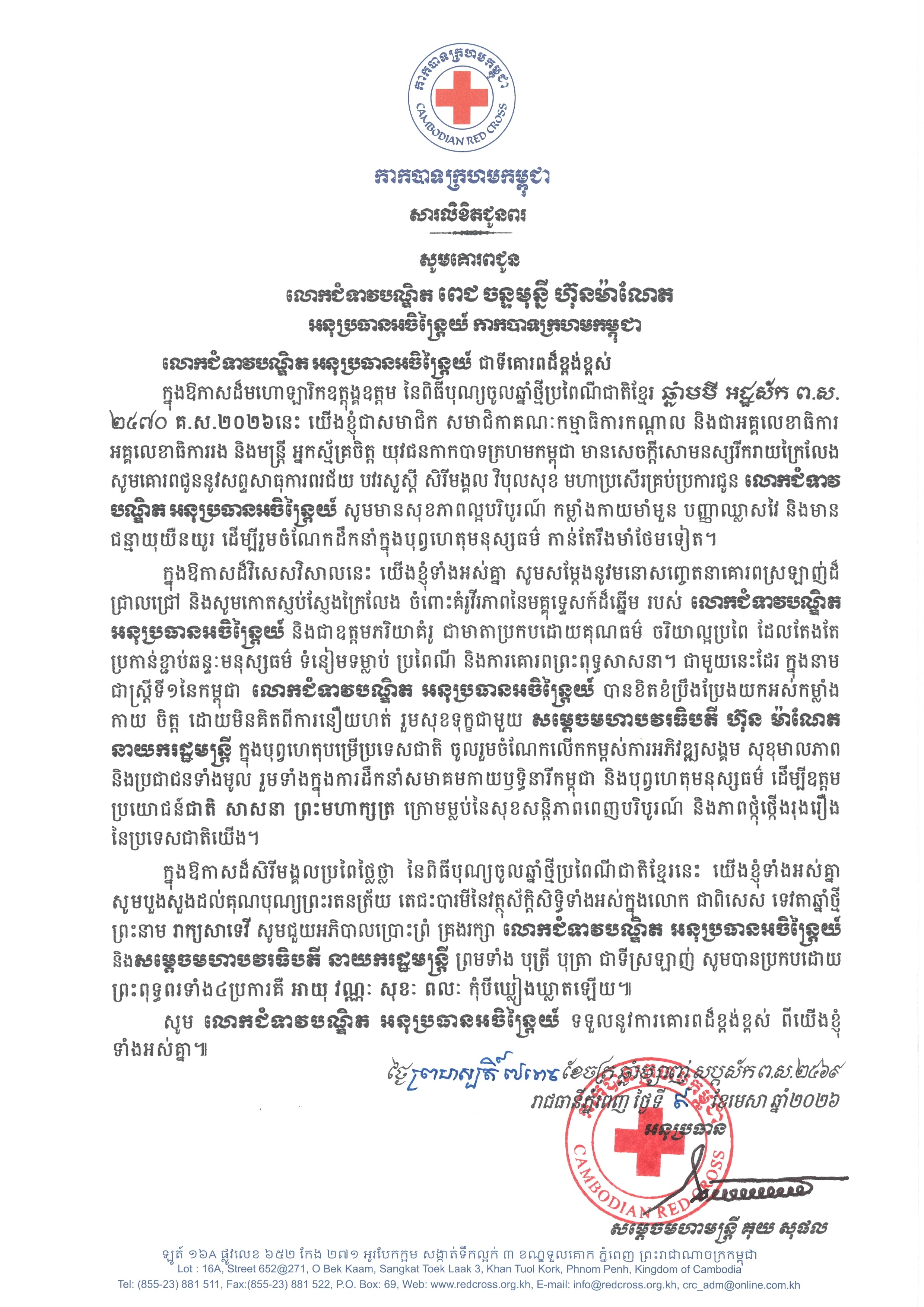 (ភ្នំពេញ)៖ ក្នុងឱកាសដ៏មហោឡារិកឧត្តុង្គឧត្តម នៃពិធីបុណ្យចូលឆ្នាំថ្មីប្រពៃណីជាតិខ្មែរ ឆ្នាំមមី អដ្ឋស័ក ព.ស. ២៥៧០ គ.ស.២០២៦នេះ យើងខ្ញុំជាសមាជិក សមាជិកាគណៈកម្មាធិការកណ្តាល និងជាអគ្គលេខាធិការ អគ្គលេខាធិការរង និងមន្ត្រី អ្នកស្ម័គ្រចិត្ត យុវជនកាកបាទក្រហមកម្ពុជា មានសេចក្តីសោមនស្សរីករាយក្រៃលែង សូមគោរពជូននូវសព្ទសាធុការពរជ័យ បវរសួស្តី សិរីមង្គល វិបុលសុខ មហាប្រសើរគ្រប់ប្រការជូនលោកជំទាវបណ្ឌិត ពេជ ចន្ទមុន្នី ហ៊ុនម៉ាណែត អនុប្រធានអចិន្ត្រៃយ៍កាកបាទក្រហមកម្ពុជា សូមមានសុខភាពល្អបរិបូរណ៍ កម្លាំងកាយមាំមួន បញ្ញាឈ្លាសវៃ និងមាន ជន្មាយុយឺនយូរ ដើម្បីរួមចំណែកដឹកនាំក្នុងបុព្វហេតុមនុស្សធម៌ កាន់តែរឹងមាំថែមទៀត។