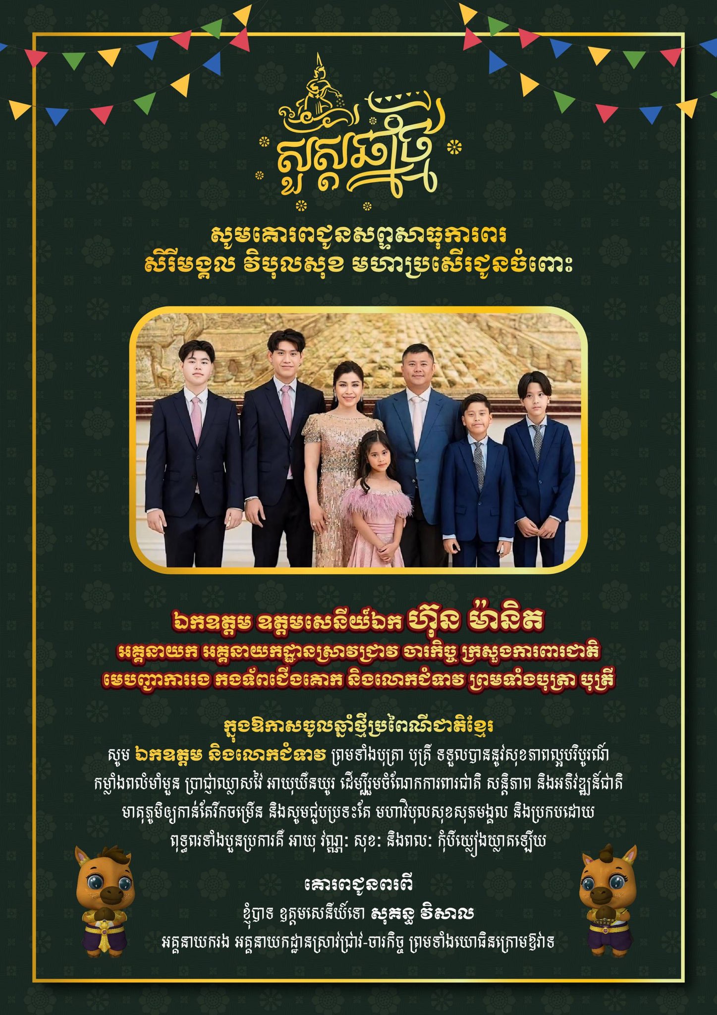 ជាថ្មីនៃឱកាសដ៏នក្ខត្តឫក្សនេះ យើងខ្ញុំទាំងអស់គ្នា សូមគោរពជូនពរ ឯកឧត្ដមឧបនាយករដ្ឋមន្ត្រី និង លោកជំទាវ ព្រមទាំង បុត្រា-បុត្រី សូម ប្រកបដោយពុទ្ធពរទាំងបួនប្រការគឺ អាយុ វណ្ណៈ សុខៈ ពលៈ កុំបីឃ្លៀងឃ្លាតឡើយ៕