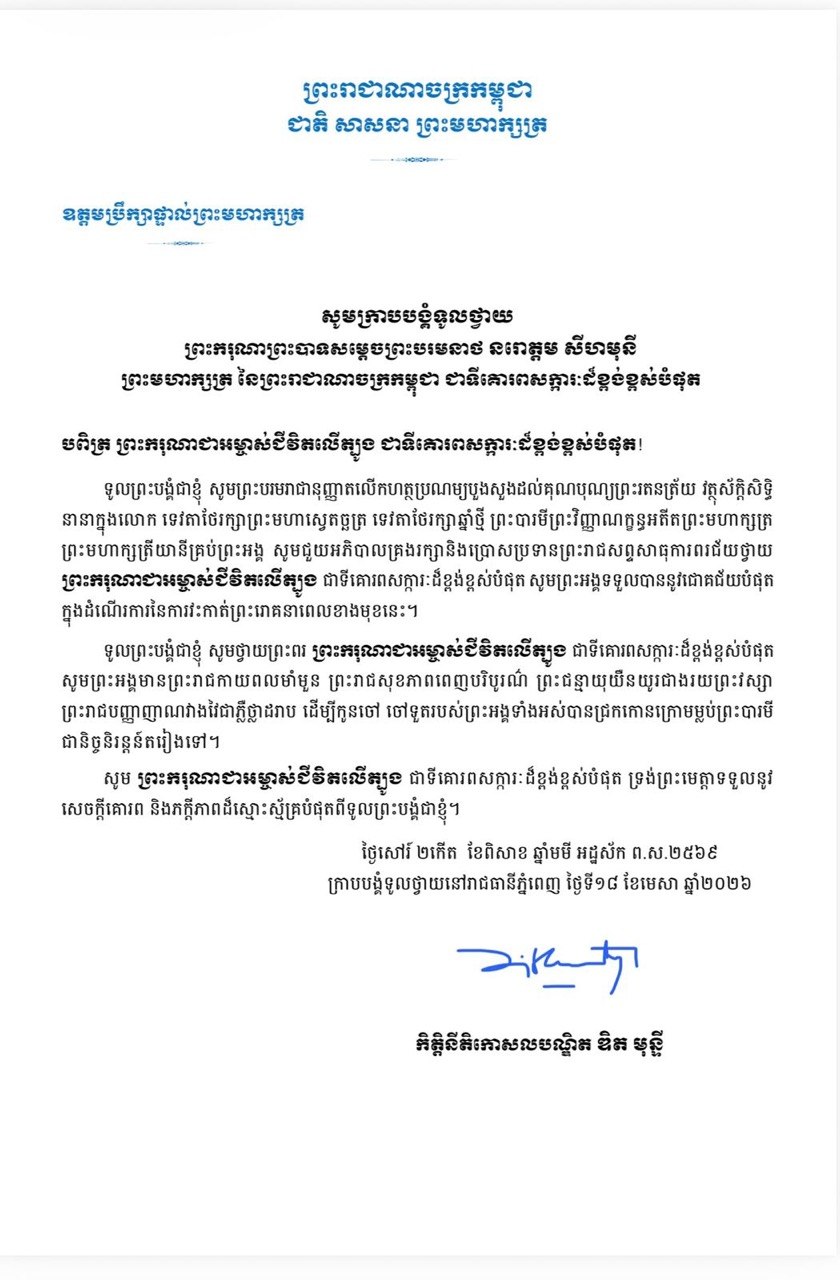 ទូលព្រះបង្គំជាខ្ញុំ សូមសម្តែងនូវក្តីបារម្ភ ក្រោយពីទទួលព័ត៌មានថា ព្រះរោគមហារីកក្រពេញប្រូស្តាត (prostate cancer) របស់ព្រះករុណា ជាអម្ចាស់ជីវិតលើត្បូង ជាទីគោរពសក្ការៈដ៏ខ្ពង់ខ្ពស់បំផុត តម្រូវឱ្យព្រះអង្គទទួលការព្យាបាលដោយការវះកាត់តាមវេជ្ជបញ្ជា នៅមន្ទីរពេទ្យនារដ្ឋធានីប៉េកាំង នៃសាធារណរដ្ឋប្រជាមានិតចិន និងបន្តគង់ប្រថាប់នៅទីនោះមួយរយៈពេល ដើម្បីតាមដានត្រួតពិនិត្យ និងព្យាបាលព្រះរោគ ចាប់ពីថ្ងៃទី១៨ ខែមេសា ឆ្នាំ២០២៦នេះ។