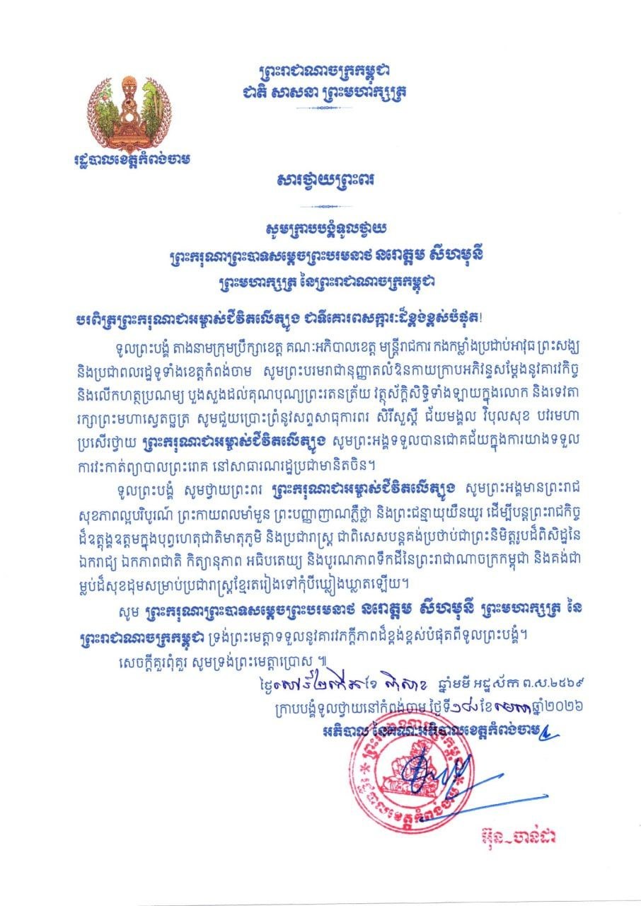 (ភ្នំពេញ)៖ ទូលព្រះបង្គំ អ៊ុន ចាន់ដា អភិបាលខេត្តកំពង់ចាម ព្រមទាំងថ្នាក់ដឹកនាំ មន្រ្តីរាជការ កងកម្លាំងប្រដាប់អាវុធ និងប្រជាពលរដ្ឋទូទាំងខេត្តកំពង់ចាម សូមក្រាបបង្គំទូលថ្វាយព្រះពរ ព្រះករុណា ព្រះបាទសម្តេចព្រះបរមនាថ នរោត្តម សីហមុនី ព្រះមហាក្សត្រ នៃព្រះរាជាណាចក្រកម្ពុជា ឆាប់បានជាសះស្បើយ ពីព្រះរោគមហារីកក្រពេញប្រូស្តាត (prostate cancer) ដែលនឹងព្យាបាលដោយវះកាត់ នៅក្នុងមន្ទីរពេទ្យរដ្ឋធានីប៉េកាំង នៃសាធារណរដ្ឋប្រជាមានិតចិន។