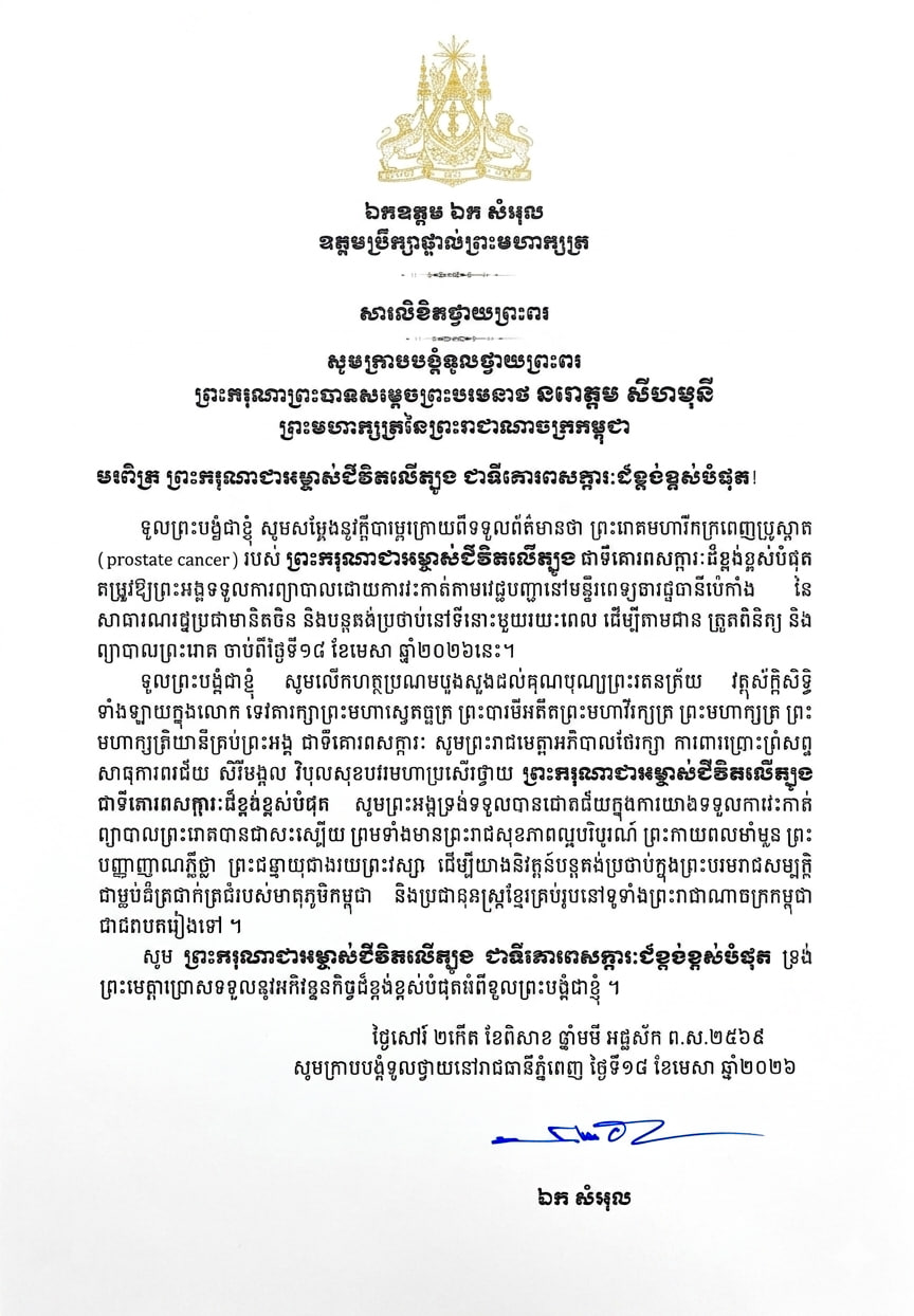 ទូលព្រះបង្គំជាខ្ញុំ សូមសម្តែងនូវក្តីបារម្ភ ក្រោយពីទទួលព័ត៌មានថា ព្រះរោគមហារីកក្រពេញប្រូស្តាត (prostate cancer) របស់ព្រះករុណា ជាអម្ចាស់ជីវិតលើត្បូង ជាទីគោរពសក្ការៈដ៏ខ្ពង់ខ្ពស់បំផុត តម្រូវឱ្យព្រះអង្គទទួលការព្យាបាលដោយការវះកាត់តាមវេជ្ជបញ្ជា នៅមន្ទីរពេទ្យនារដ្ឋធានីប៉េកាំង នៃសាធារណរដ្ឋប្រជាមានិតចិន និងបន្តគង់ប្រថាប់នៅទីនោះមួយរយៈពេល ដើម្បីតាមដានត្រួតពិនិត្យ និងព្យាបាលព្រះរោគ ចាប់ពីថ្ងៃទី១៨ ខែមេសា ឆ្នាំ២០២៦នេះ។