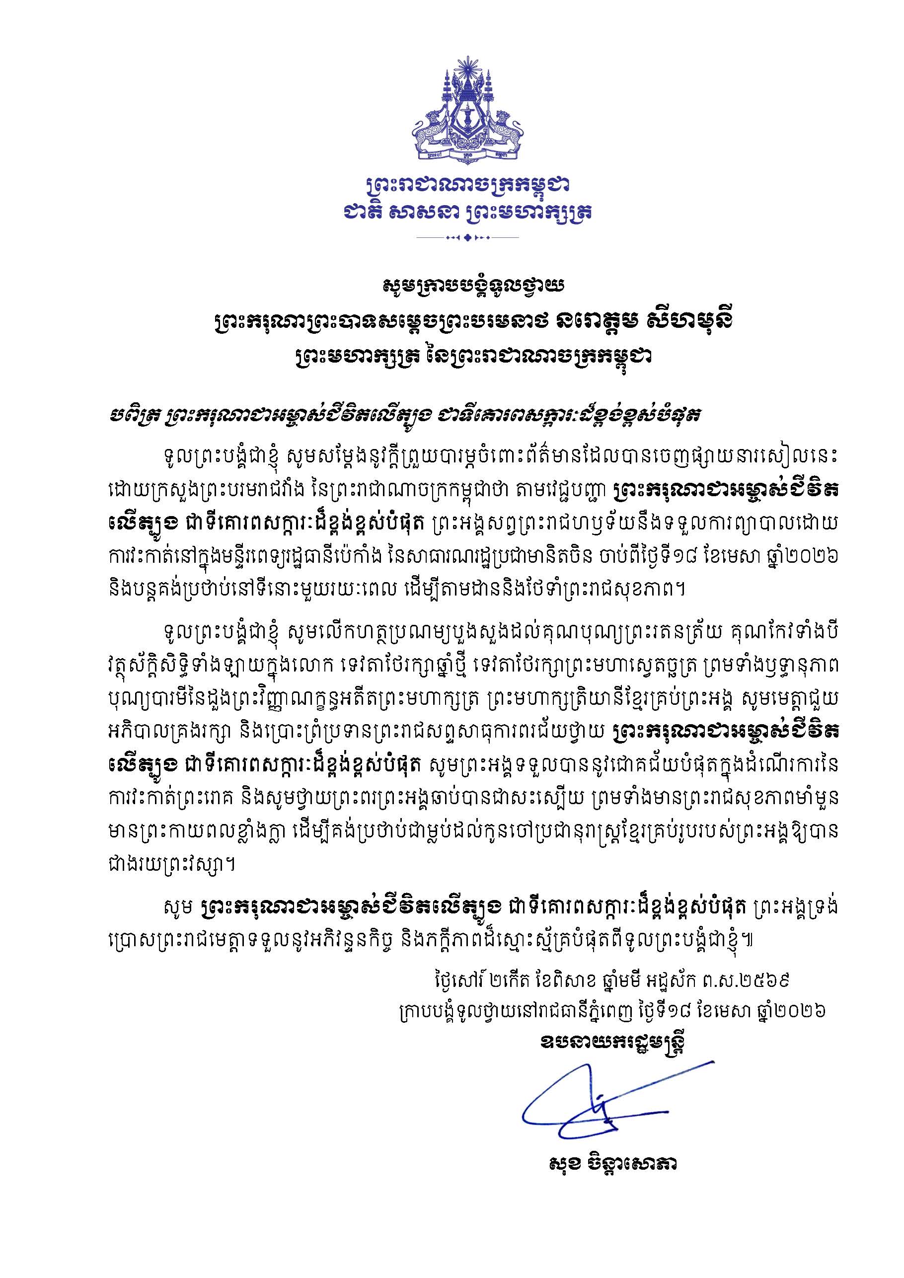 ទូលព្រះបង្គំជាខ្ញុំ សូមសម្តែងនូវក្តីបារម្ភ ក្រោយពីទទួលព័ត៌មានថា ព្រះរោគមហារីកក្រពេញប្រូស្តាត (prostate cancer) របស់ព្រះករុណា ជាអម្ចាស់ជីវិតលើត្បូង ជាទីគោរពសក្ការៈដ៏ខ្ពង់ខ្ពស់បំផុត តម្រូវឱ្យព្រះអង្គទទួលការព្យាបាលដោយការវះកាត់តាមវេជ្ជបញ្ជា នៅមន្ទីរពេទ្យនារដ្ឋធានីប៉េកាំង នៃសាធារណរដ្ឋប្រជាមានិតចិន និងបន្តគង់ប្រថាប់នៅទីនោះមួយរយៈពេល ដើម្បីតាមដានត្រួតពិនិត្យ និងព្យាបាលព្រះរោគ ចាប់ពីថ្ងៃទី១៨ ខែមេសា ឆ្នាំ២០២៦នេះ។