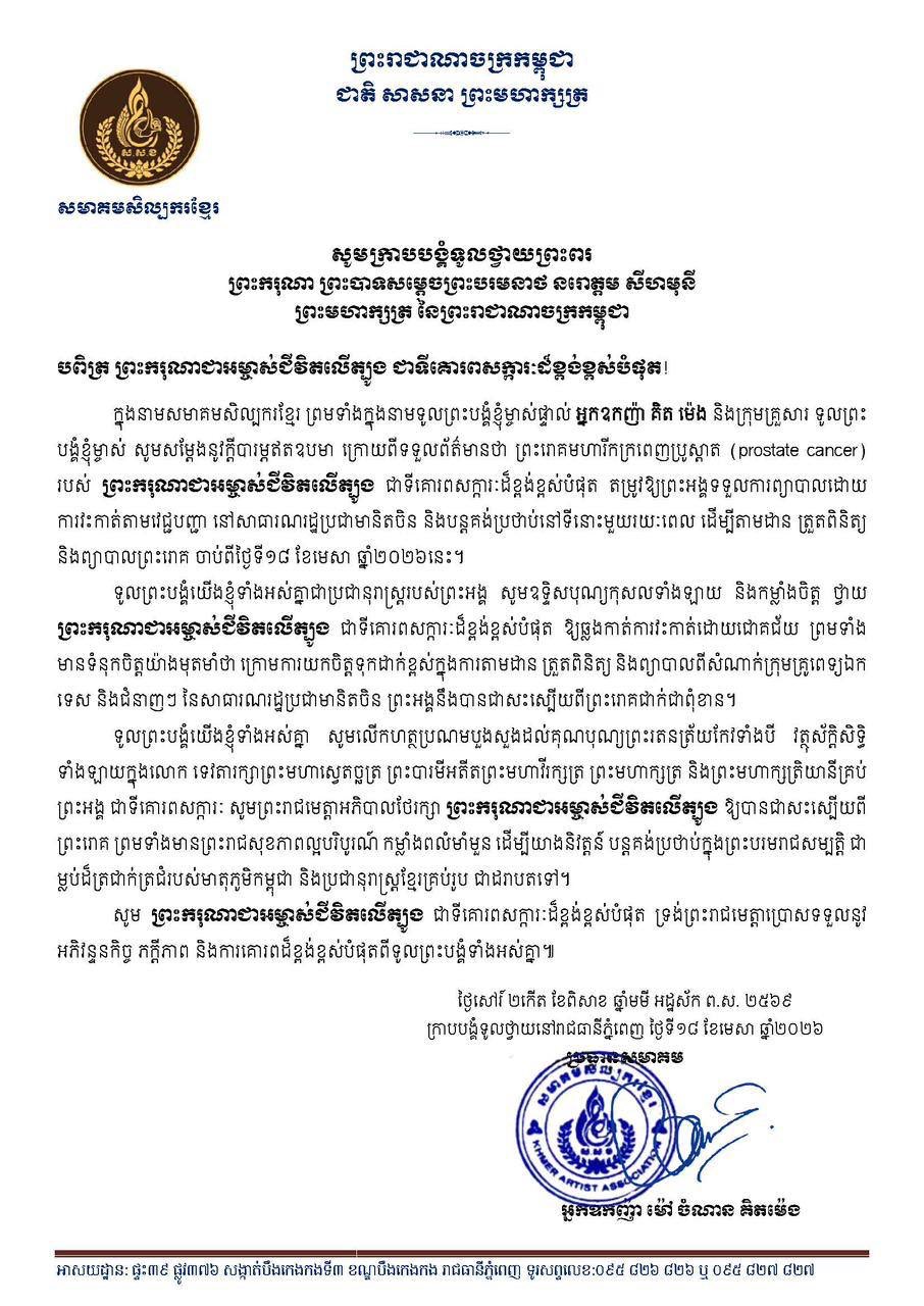 ទូលព្រះបង្គំជាខ្ញុំ សូមសម្តែងនូវក្តីបារម្ភ ក្រោយពីទទួលព័ត៌មានថា ព្រះរោគមហារីកក្រពេញប្រូស្តាត (prostate cancer) របស់ព្រះករុណា ជាអម្ចាស់ជីវិតលើត្បូង ជាទីគោរពសក្ការៈដ៏ខ្ពង់ខ្ពស់បំផុត តម្រូវឱ្យព្រះអង្គទទួលការព្យាបាលដោយការវះកាត់តាមវេជ្ជបញ្ជា នៅមន្ទីរពេទ្យនារដ្ឋធានីប៉េកាំង នៃសាធារណរដ្ឋប្រជាមានិតចិន និងបន្តគង់ប្រថាប់នៅទីនោះមួយរយៈពេល ដើម្បីតាមដានត្រួតពិនិត្យ និងព្យាបាលព្រះរោគ ចាប់ពីថ្ងៃទី១៨ ខែមេសា ឆ្នាំ២០២៦នេះ។