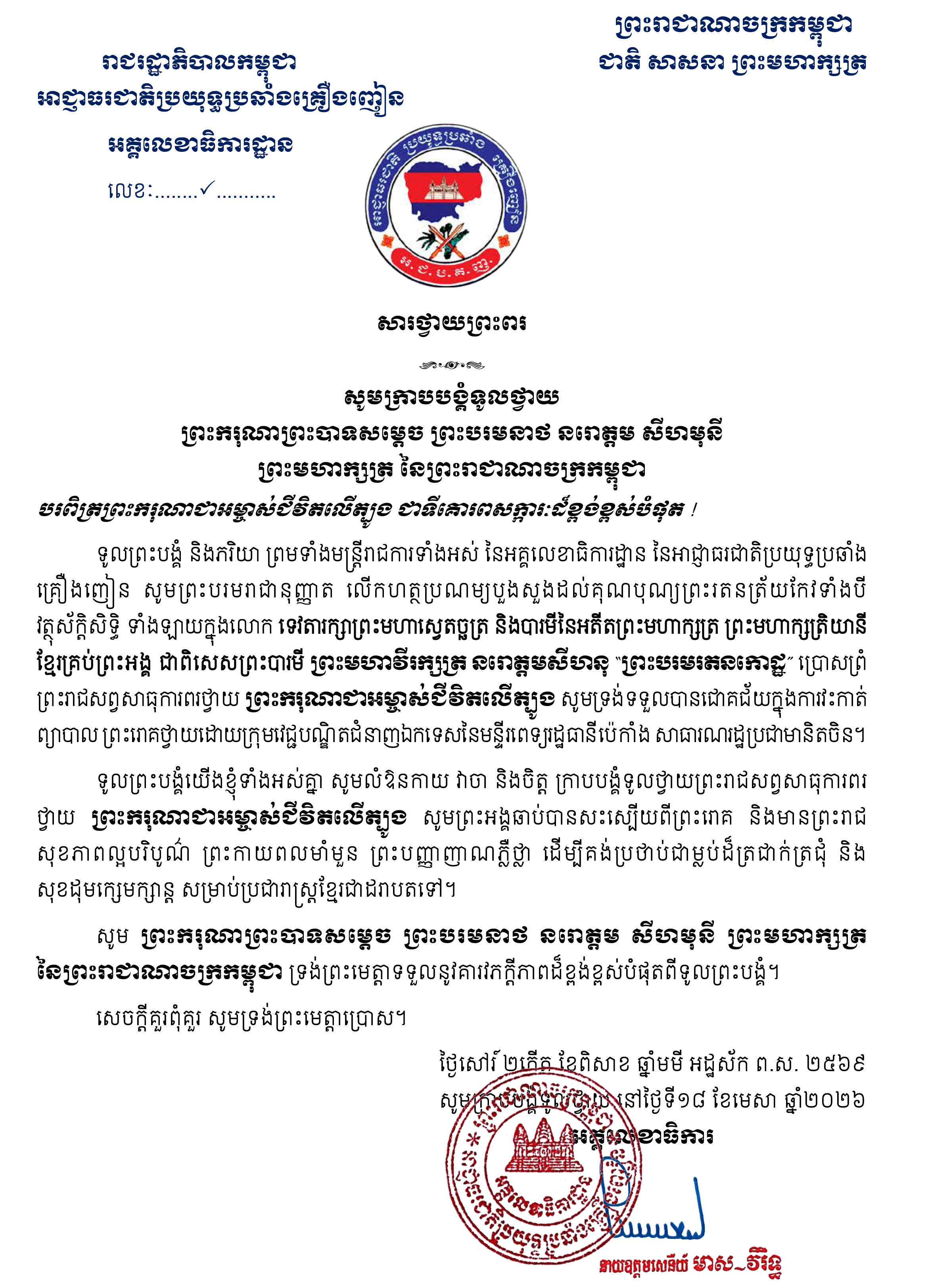 (ភ្នំពេញ)៖ ទូលព្រះបង្គំ មាស វិរិទ្ធ អគ្គលេខាធិការ អគ្គលេខាធិការដ្ឋាន នៃអាជ្ញាធរជាតិប្រយុទ្ធប្រឆាំងគ្រឿងញៀន សូមក្រាបបង្គំទូលថ្វាយព្រះពរ ព្រះករុណា ព្រះបាទសម្តេចព្រះបរមនាថ នរោត្តម សីហមុនី ព្រះមហាក្សត្រ នៃព្រះរាជាណាចក្រកម្ពុជា ឆាប់បានជាសះស្បើយ ពីព្រះរោគមហារីកក្រពេញប្រូស្តាត (prostate cancer) ដែលនឹងព្យាបាលដោយវះកាត់ នៅក្នុងមន្ទីរពេទ្យរដ្ឋធានីប៉េកាំង នៃសាធារណរដ្ឋប្រជាមានិតចិន។