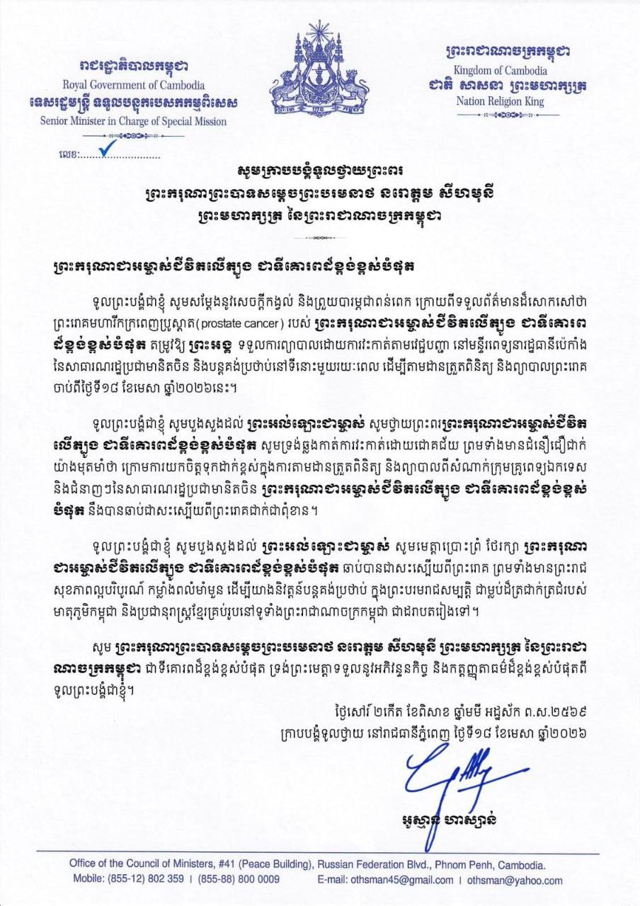 ទូលព្រះបង្គំមានសេចក្តីកង្វល់ និងព្រួយបារម្ភជាពន់ពេក បន្ទាប់ពីបានទទួលដំណឹងដ៏សោកសៅថា ព្រះករុណាជាអម្ចាស់ជីវិតលើត្បូង ជាទីគោរពដ៏ខ្ពង់ខ្ពស់បំផុត ទ្រង់មានព្រះរោគមហារីកនៅក្រពេញ ប្រូស្តាត តាមការពិនិត្យដោយយកចិត្តទុកដាក់ល្អិតល្អន់ជាទីបំផុត ពីក្រុមគ្រូពេទ្យនៃមន្ទីរពទ្យរដ្ឋធានីប៉េកាំង សាធារណរដ្ឋ ប្រជាមានិតចិន កាលពីថ្ងៃទី១០ ខែមេសា ឆ្នាំ២០២៦។