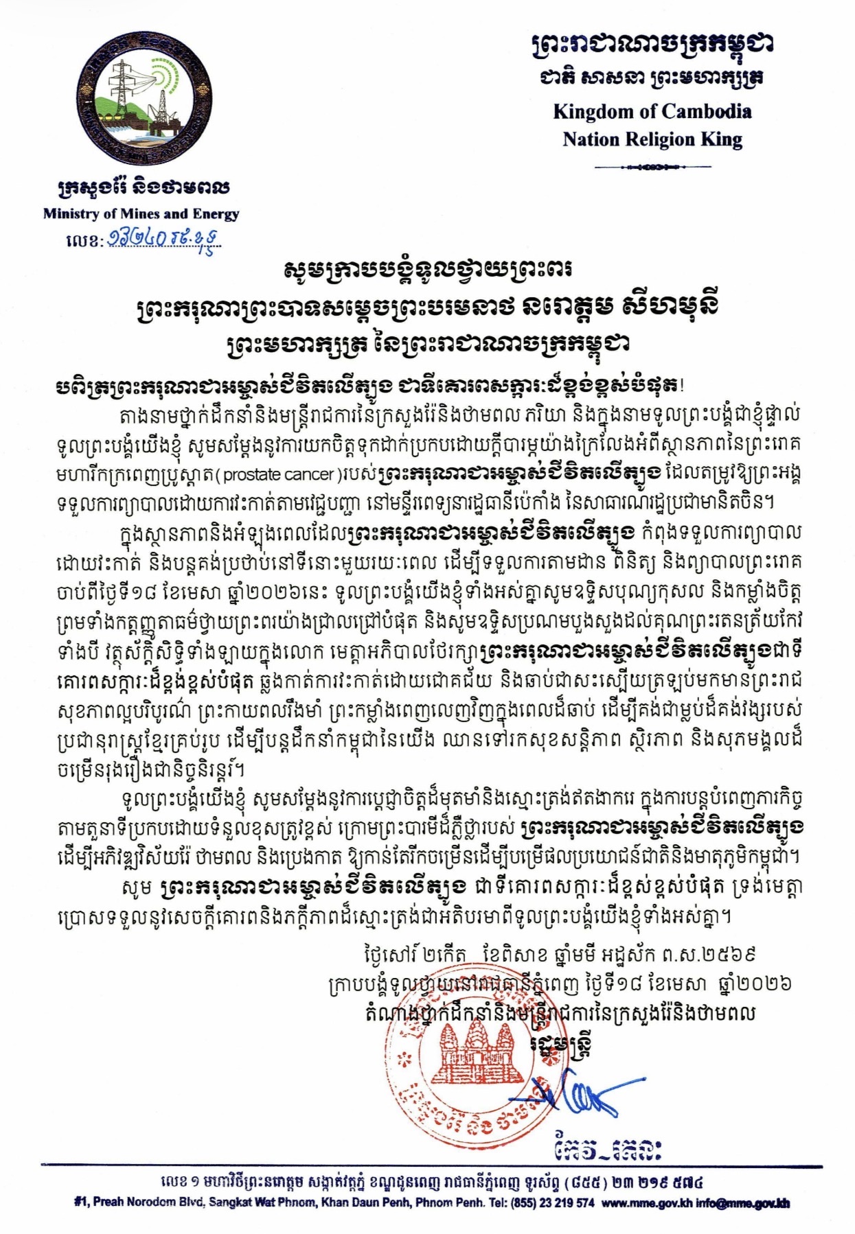 ទូលព្រះបង្គំជាខ្ញុំ សូមសម្តែងនូវក្តីបារម្ភ ក្រោយពីទទួលព័ត៌មានថា ព្រះរោគមហារីកក្រពេញប្រូស្តាត (prostate cancer) របស់ព្រះករុណា ជាអម្ចាស់ជីវិតលើត្បូង ជាទីគោរពសក្ការៈដ៏ខ្ពង់ខ្ពស់បំផុត តម្រូវឱ្យព្រះអង្គទទួលការព្យាបាលដោយការវះកាត់តាមវេជ្ជបញ្ជា នៅមន្ទីរពេទ្យនារដ្ឋធានីប៉េកាំង នៃសាធារណរដ្ឋប្រជាមានិតចិន និងបន្តគង់ប្រថាប់នៅទីនោះមួយរយៈពេល ដើម្បីតាមដានត្រួតពិនិត្យ និងព្យាបាលព្រះរោគ ចាប់ពីថ្ងៃទី១៨ ខែមេសា ឆ្នាំ២០២៦នេះ។