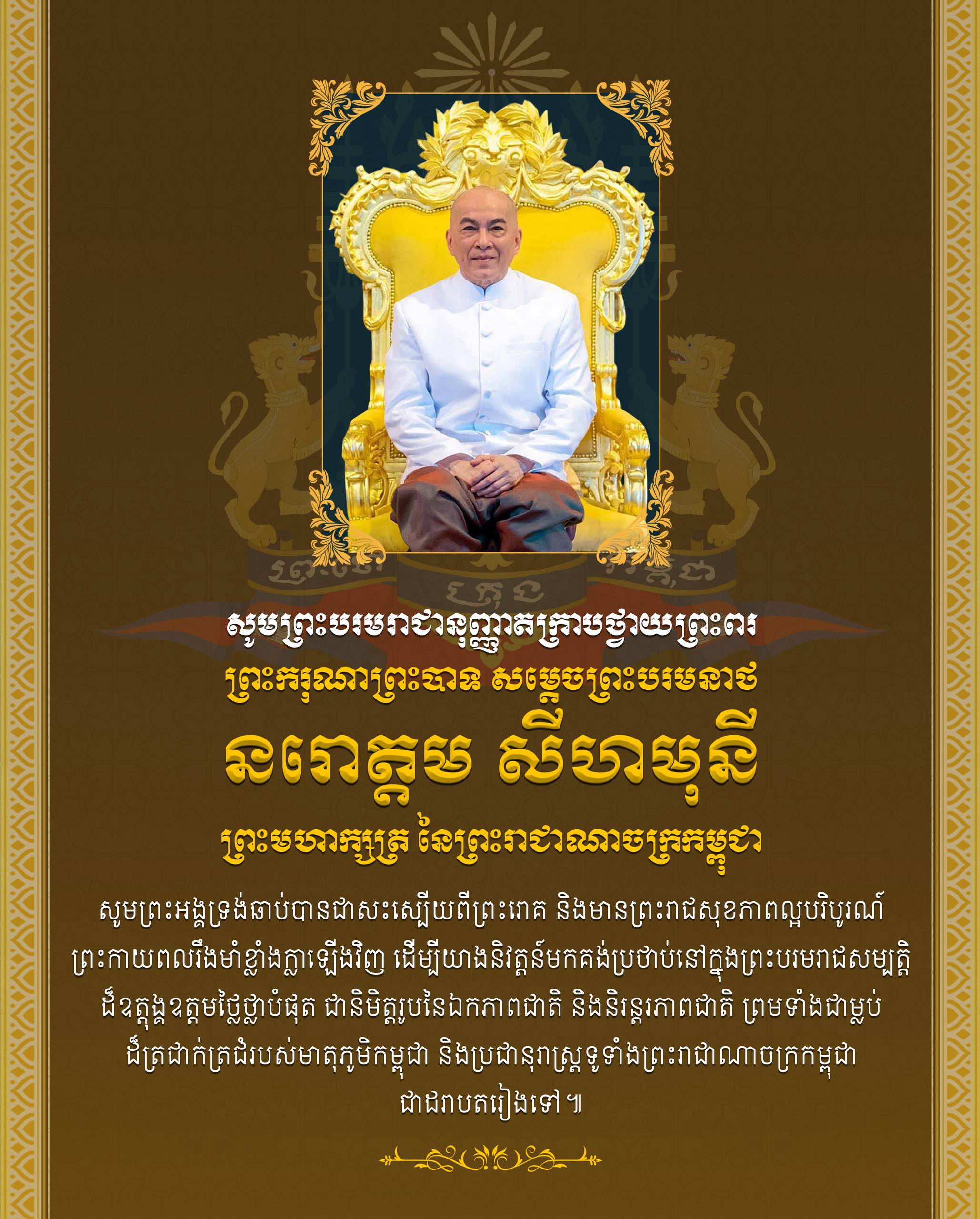 សូម ព្រះករុណាជាអម្ចាស់ជីវិតលើត្បូង ជាទីគោរពសក្ការៈដ៏ខ្ពង់ខ្ពស់បំផុត ទ្រង់ព្រះមេត្តាប្រោស ទទួលនូវគារវភក្តីដ៏មហាខ្ពង់ខ្ពស់បំផុតពីទូលព្រះបង្គំជាខ្ញុំទាំងអស់គ្នា៕