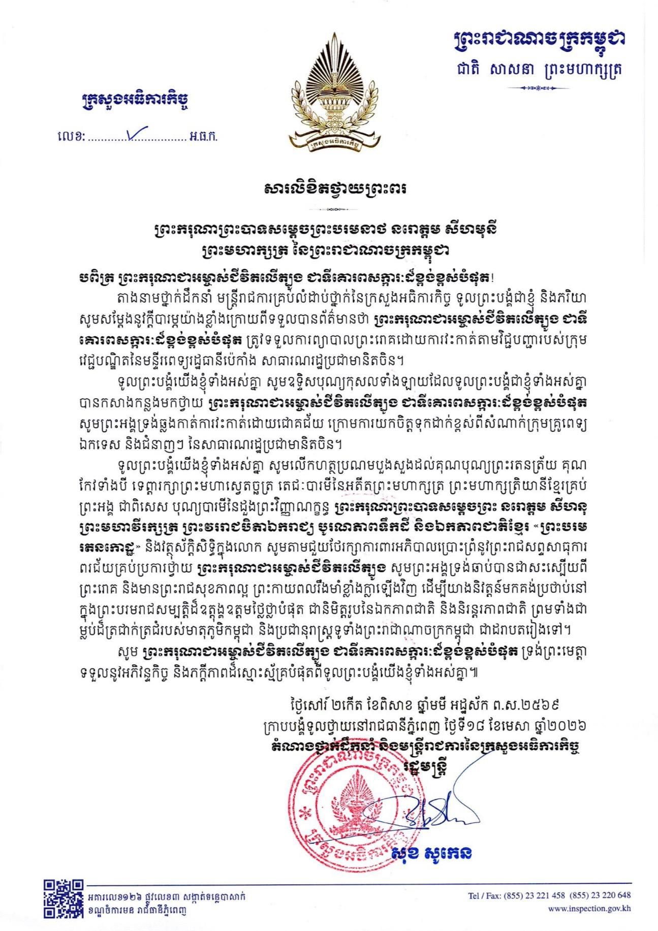 ទូលព្រះបង្គំជាខ្ញុំ សូមសម្តែងនូវក្តីបារម្ភ ក្រោយពីទទួលព័ត៌មានថា ព្រះរោគមហារីកក្រពេញប្រូស្តាត (prostate cancer) របស់ព្រះករុណា ជាអម្ចាស់ជីវិតលើត្បូង ជាទីគោរពសក្ការៈដ៏ខ្ពង់ខ្ពស់បំផុត តម្រូវឱ្យព្រះអង្គទទួលការព្យាបាលដោយការវះកាត់តាមវេជ្ជបញ្ជា នៅមន្ទីរពេទ្យនារដ្ឋធានីប៉េកាំង នៃសាធារណរដ្ឋប្រជាមានិតចិន និងបន្តគង់ប្រថាប់នៅទីនោះមួយរយៈពេល ដើម្បីតាមដានត្រួតពិនិត្យ និងព្យាបាលព្រះរោគ ចាប់ពីថ្ងៃទី១៨ ខែមេសា ឆ្នាំ២០២៦នេះ។