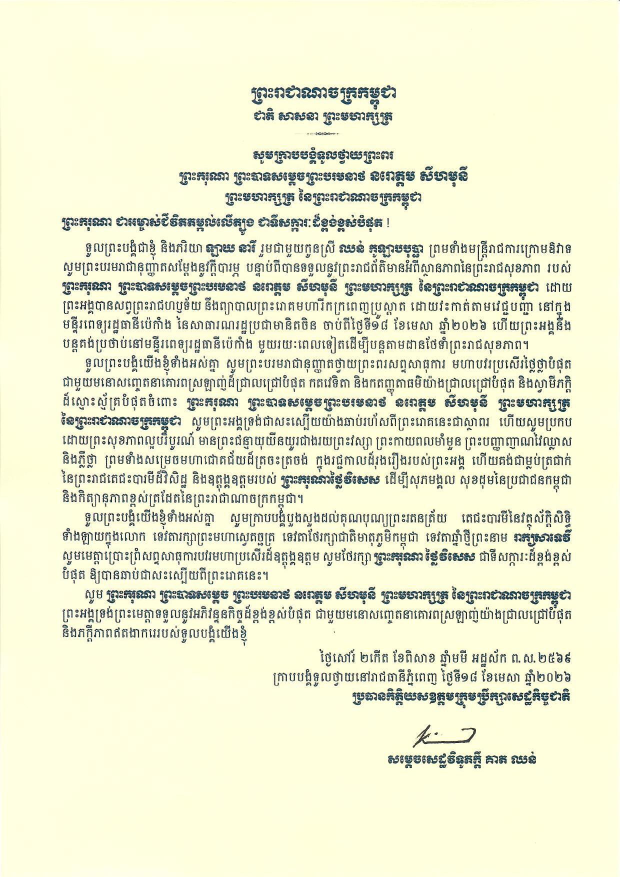 ទូលព្រះបង្គំជាខ្ញុំ សូមសម្តែងនូវក្តីបារម្ភ ក្រោយពីទទួលព័ត៌មានថា ព្រះរោគមហារីកក្រពេញប្រូស្តាត (prostate cancer) របស់ព្រះករុណា ជាអម្ចាស់ជីវិតលើត្បូង ជាទីគោរពសក្ការៈដ៏ខ្ពង់ខ្ពស់បំផុត តម្រូវឱ្យព្រះអង្គទទួលការព្យាបាលដោយការវះកាត់តាមវេជ្ជបញ្ជា នៅមន្ទីរពេទ្យនារដ្ឋធានីប៉េកាំង នៃសាធារណរដ្ឋប្រជាមានិតចិន និងបន្តគង់ប្រថាប់នៅទីនោះមួយរយៈពេល ដើម្បីតាមដានត្រួតពិនិត្យ និងព្យាបាលព្រះរោគ ចាប់ពីថ្ងៃទី១៨ ខែមេសា ឆ្នាំ២០២៦នេះ។