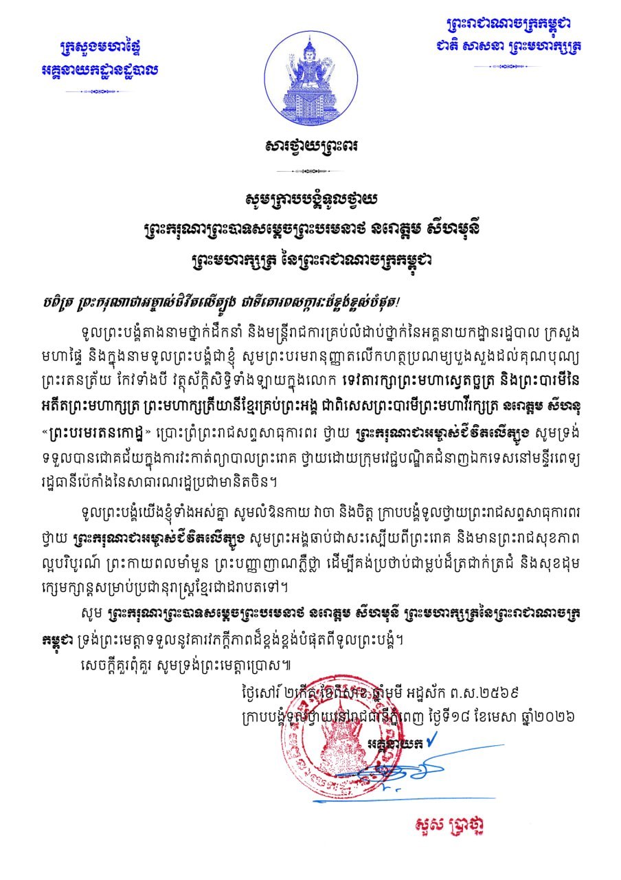 ទូលព្រះបង្គំជាខ្ញុំ សូមសម្តែងនូវក្តីបារម្ភ ក្រោយពីទទួលព័ត៌មានថា ព្រះរោគមហារីកក្រពេញប្រូស្តាត (prostate cancer) របស់ព្រះករុណា ជាអម្ចាស់ជីវិតលើត្បូង ជាទីគោរពសក្ការៈដ៏ខ្ពង់ខ្ពស់បំផុត តម្រូវឱ្យព្រះអង្គទទួលការព្យាបាលដោយការវះកាត់តាមវេជ្ជបញ្ជា នៅមន្ទីរពេទ្យនារដ្ឋធានីប៉េកាំង នៃសាធារណរដ្ឋប្រជាមានិតចិន និងបន្តគង់ប្រថាប់នៅទីនោះមួយរយៈពេល ដើម្បីតាមដានត្រួតពិនិត្យ និងព្យាបាលព្រះរោគ ចាប់ពីថ្ងៃទី១៨ ខែមេសា ឆ្នាំ២០២៦នេះ។