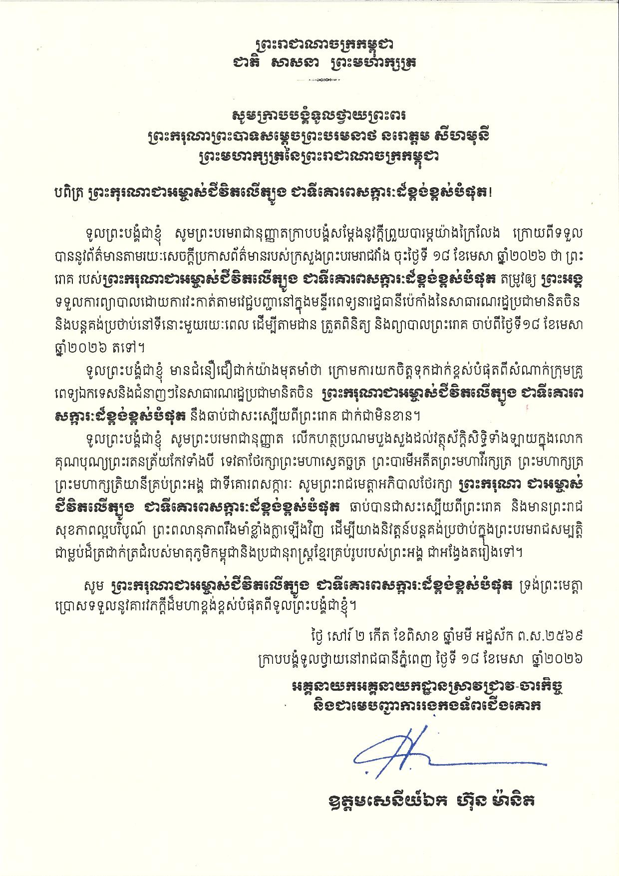 ទូលព្រះបង្គំជាខ្ញុំ សូមសម្តែងនូវក្តីបារម្ភ ក្រោយពីទទួលព័ត៌មានថា ព្រះរោគមហារីកក្រពេញប្រូស្តាត (prostate cancer) របស់ព្រះករុណា ជាអម្ចាស់ជីវិតលើត្បូង ជាទីគោរពសក្ការៈដ៏ខ្ពង់ខ្ពស់បំផុត តម្រូវឱ្យព្រះអង្គទទួលការព្យាបាលដោយការវះកាត់តាមវេជ្ជបញ្ជា នៅមន្ទីរពេទ្យនារដ្ឋធានីប៉េកាំង នៃសាធារណរដ្ឋប្រជាមានិតចិន និងបន្តគង់ប្រថាប់នៅទីនោះមួយរយៈពេល ដើម្បីតាមដានត្រួតពិនិត្យ និងព្យាបាលព្រះរោគ ចាប់ពីថ្ងៃទី១៨ ខែមេសា ឆ្នាំ២០២៦នេះ។