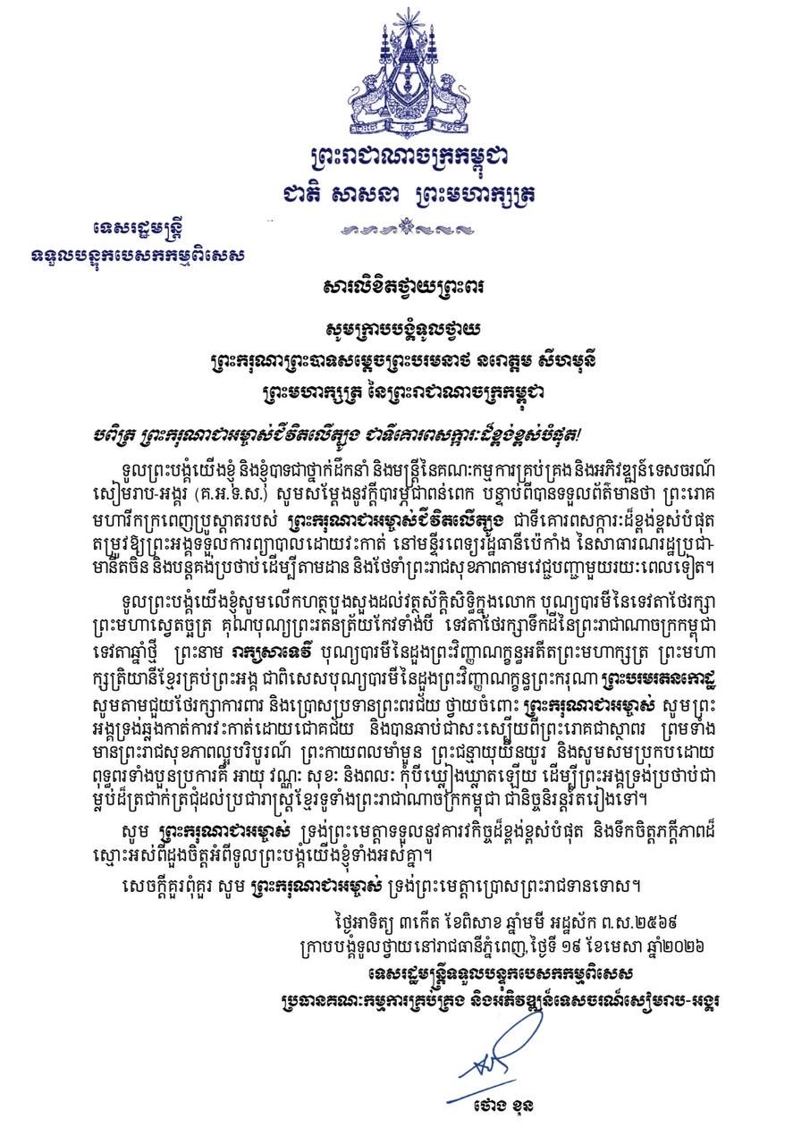 ទូលព្រះបង្គំជាខ្ញុំ សូមសម្តែងនូវក្តីបារម្ភ ក្រោយពីទទួលព័ត៌មានថា ព្រះរោគមហារីកក្រពេញប្រូស្តាត (prostate cancer) របស់ព្រះករុណា ជាអម្ចាស់ជីវិតលើត្បូង ជាទីគោរពសក្ការៈដ៏ខ្ពង់ខ្ពស់បំផុត តម្រូវឱ្យព្រះអង្គទទួលការព្យាបាលដោយការវះកាត់តាមវេជ្ជបញ្ជា នៅមន្ទីរពេទ្យនារដ្ឋធានីប៉េកាំង នៃសាធារណរដ្ឋប្រជាមានិតចិន និងបន្តគង់ប្រថាប់នៅទីនោះមួយរយៈពេល ដើម្បីតាមដានត្រួតពិនិត្យ និងព្យាបាលព្រះរោគ ចាប់ពីថ្ងៃទី១៨ ខែមេសា ឆ្នាំ២០២៦នេះ។