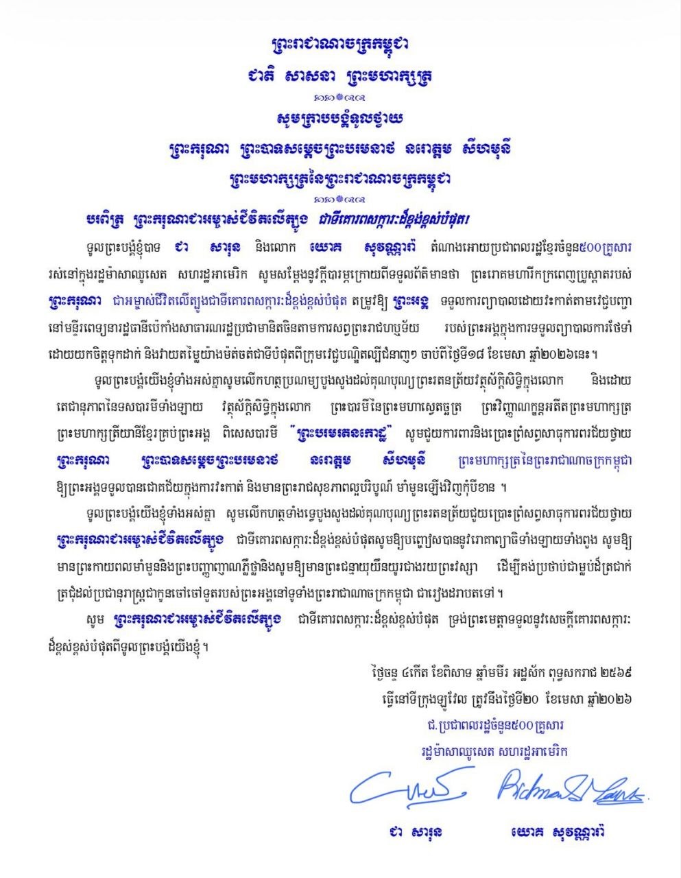 (ភ្នំពេញ)៖ ទូលព្រះបង្គំ ជា សារុន និងទូលព្រះបង្គំ យោគ សុវណ្ណរ៉ា តំណាងអោយប្រជាពលរដ្ឋខ្មែរចំនួន៥០០គ្រួសារ រស់នៅក្នុងរដ្ឋម៉ាសាឈូសេត សហរដ្ឋអាមេរិក សូមព្រះបរមរាជានុញ្ញាត សម្តែងនូវសេចក្ដីសោមនស្សរីករាយ និងត្រេកអរជាអនេក ក្រោយពីបានទទួលដំណឹង តាមរយៈសេចក្តីប្រកាសព័ត៌មាន របស់ក្រសួងព្រះបរមរាជវាំង និងការបង្ហោះសារ របស់សម្តេចតេជោ ហ៊ុន សែន ប្រធានព្រឹទ្ធសភា មកថា ព្រះករុណាព្រះបាទ សម្តេចព្រះបរមនាថ នរោត្តម សីហមុនី ព្រះមហាក្សត្រ នៃព្រះរាជាណាចក្រកម្ពុជា ជាទីគោរពសក្ការៈដ៏ខ្ពង់ខ្ពស់បំផុត ទ្រង់បានទទួលការវះកាត់ប្រកបដោយជោគជ័យ ហើយព្រះរាជសុខភាពព្រះអង្គបានប្រសើរច្រើន។